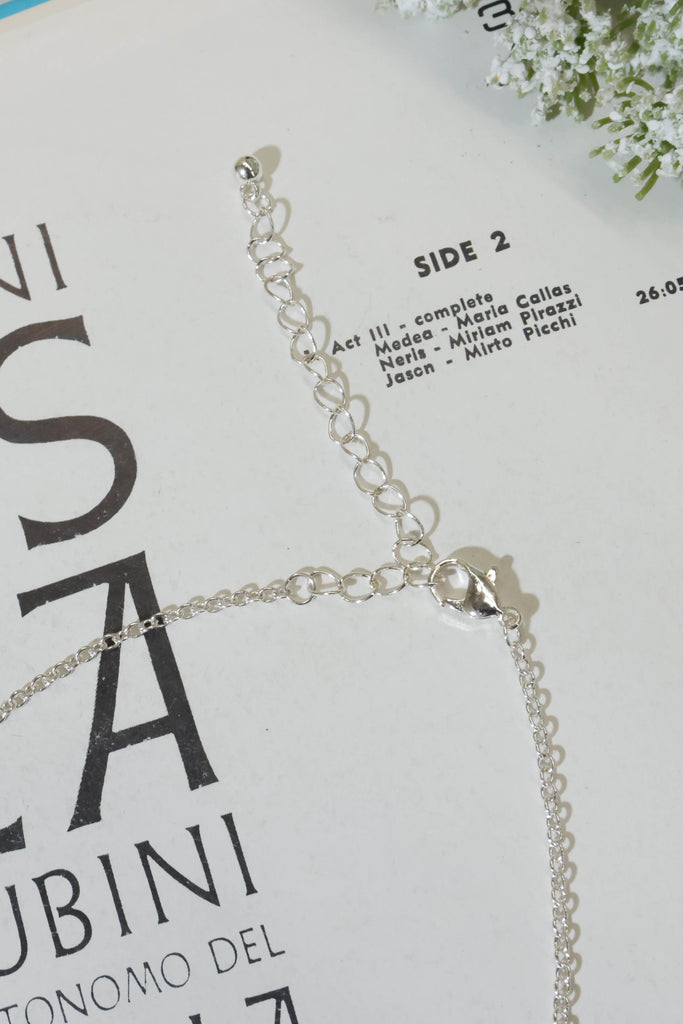 A silver necklace featuring a starfish pendant and a single pearl complete with a lobster clasp and extender settings.