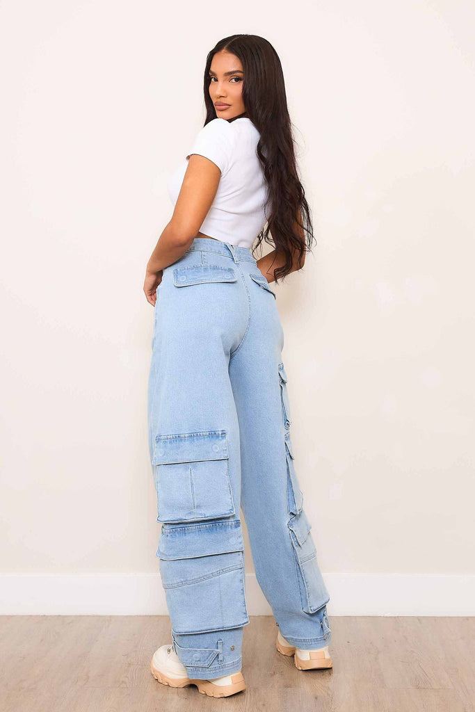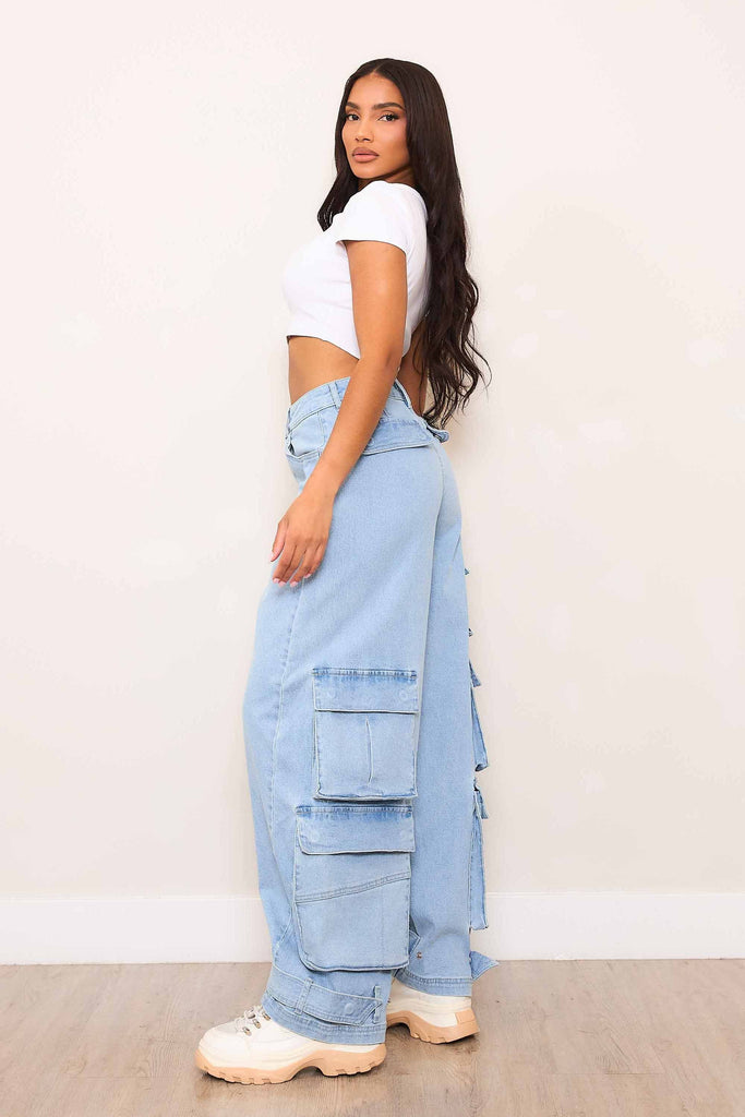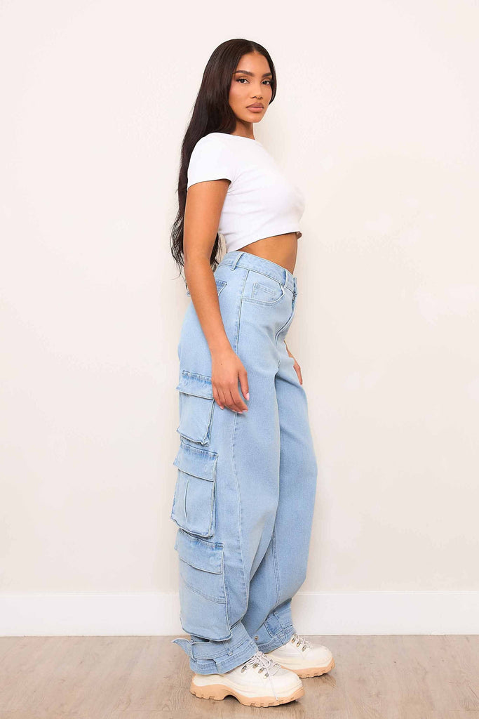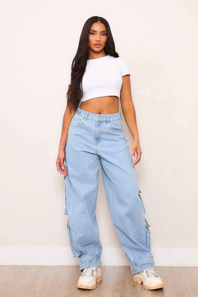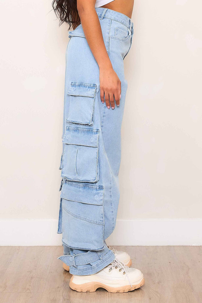 A pair of barrel baggy cargo jeans featuring cargo pockets, adjustable leg opening with strap & snap button, classic 5-pocket construction and a zip-fly closure.
