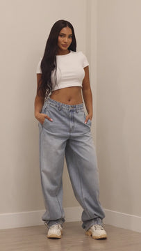 A pair of baggy jeans featuring adjustable buckled on the leg opening, front & back pockets and a zip-fly closure.