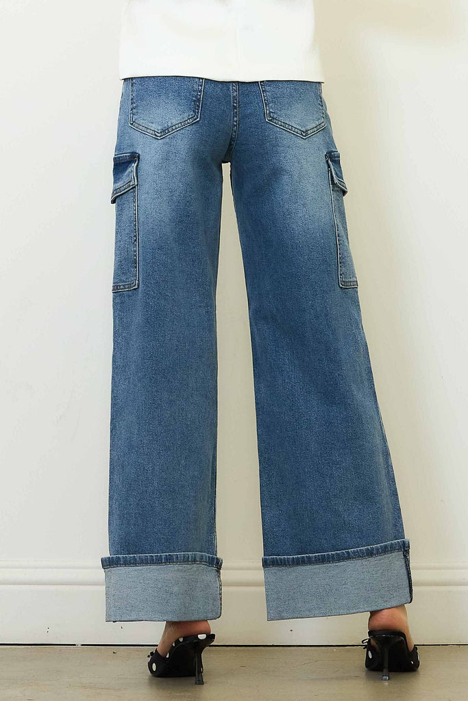 A pair of wide leg jeans featuring cargo pockets, cuff hem, classic 5-pocket construction and a zip-fly closure.