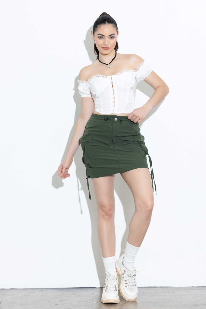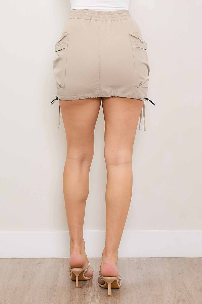 A cargo mini skirt featuring cargo pockets with string details, elastic waist band with draw strings, inside lining shorts, adjustable drawstring opening hem and a zip-fly closure.
