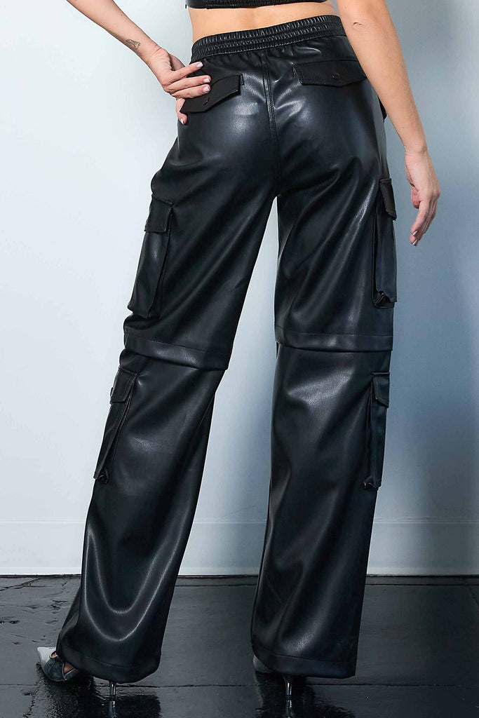 A pair of faux leather cargo pants featuring elastic band waist with draw strings, front & back pockets with snap buttons, cargo pockets, adjustable leg opening with draw strings and a zip-fly closure.