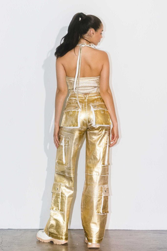 A gold metallic holter top featuring chest flap pockets, back smocking and a button-up closure.