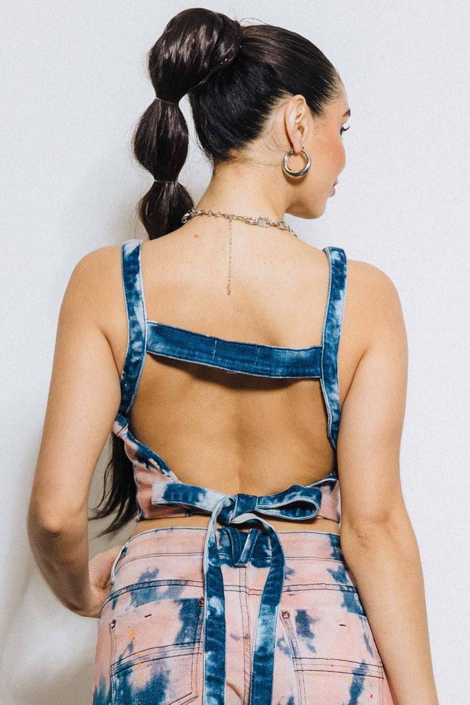 A fitted denim top featuring tie dye with paint splash look and open back with ribbon tie.