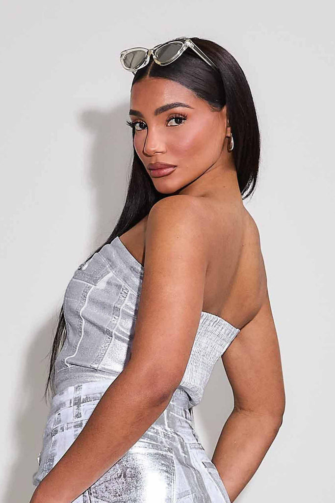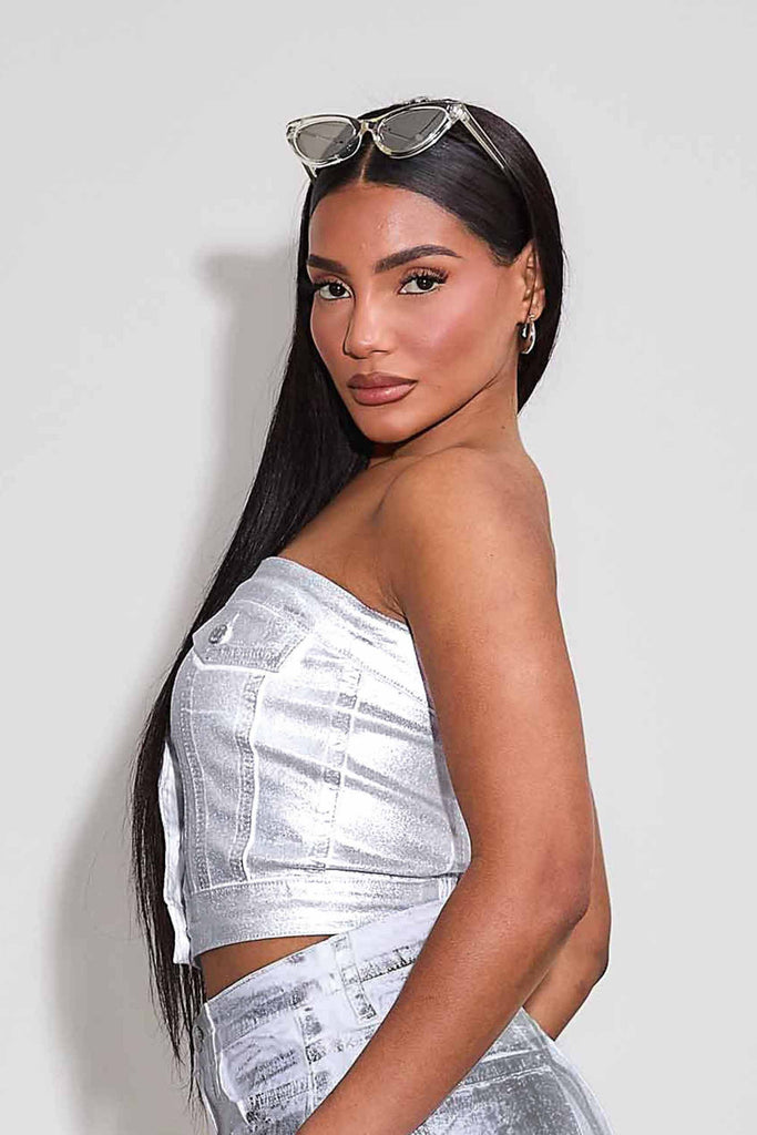 A metallic silver top featuring chest flap pockets, back smocking and a button-up closure.