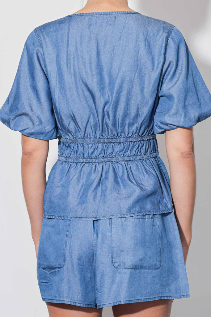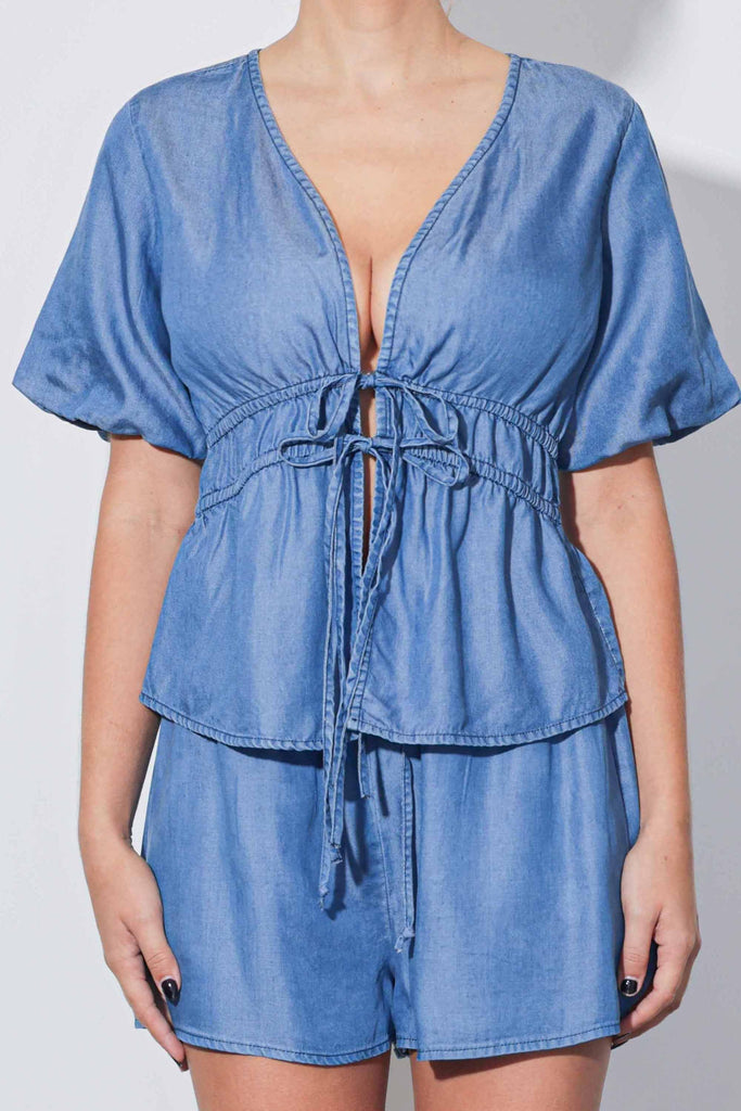 A TENCEL™ fibers top featuring puff sleeves with elastic and front ribbon strap finish.