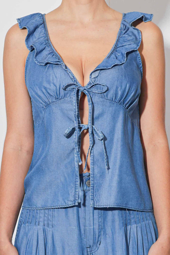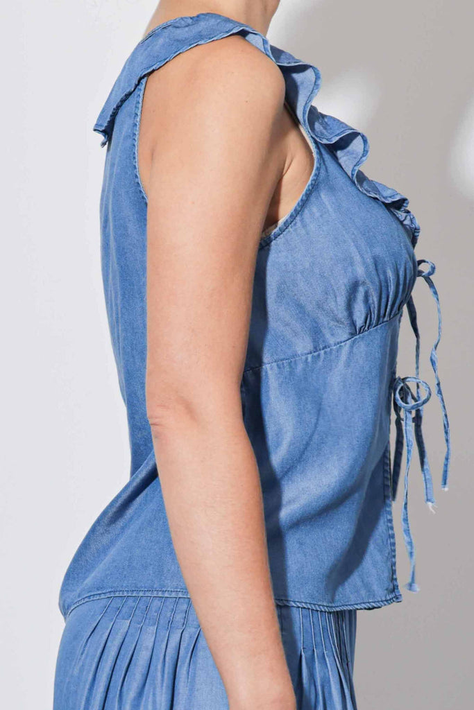 A TENCEL™ fibers top featuring ruffle neck and front ribbon strap finish.