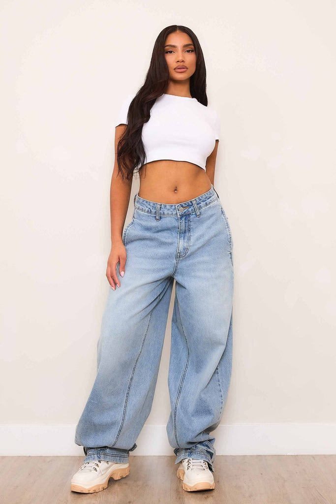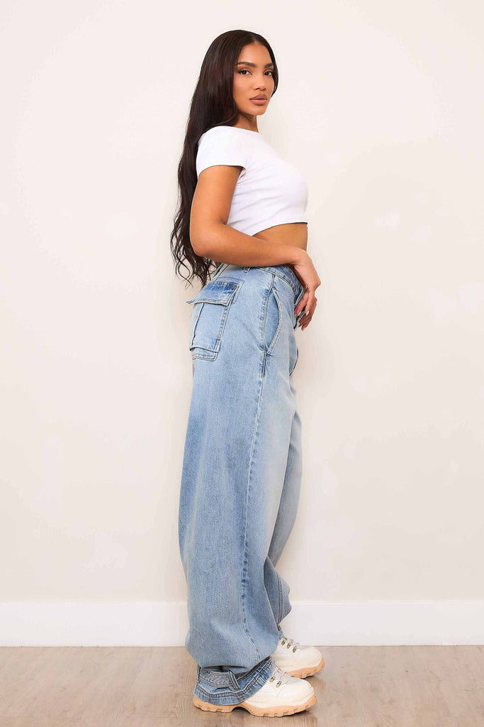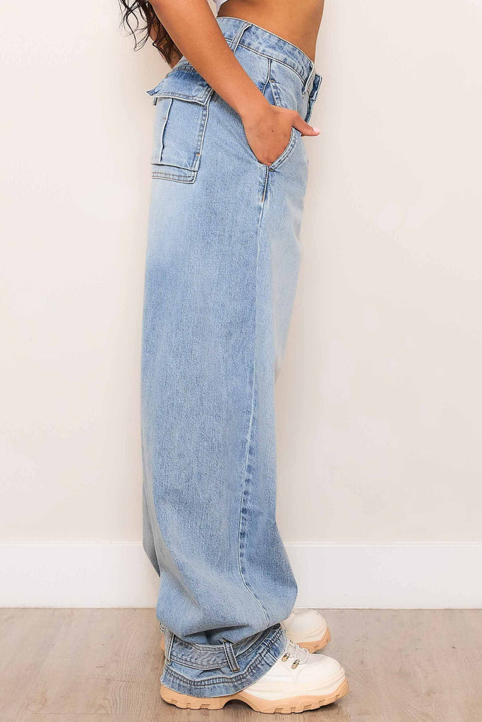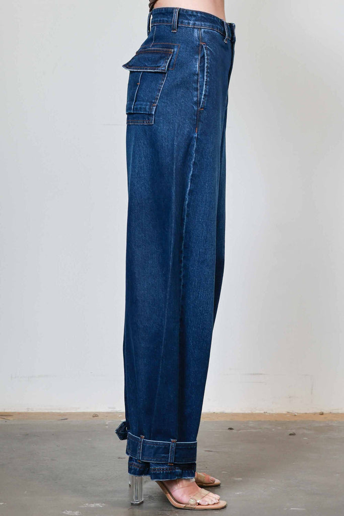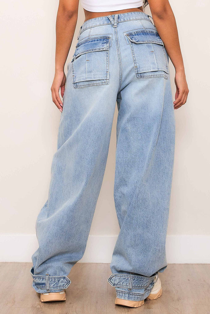 A pair of baggy jeans featuring adjustable buckled on the leg opening, front & back pockets and a zip-fly closure.