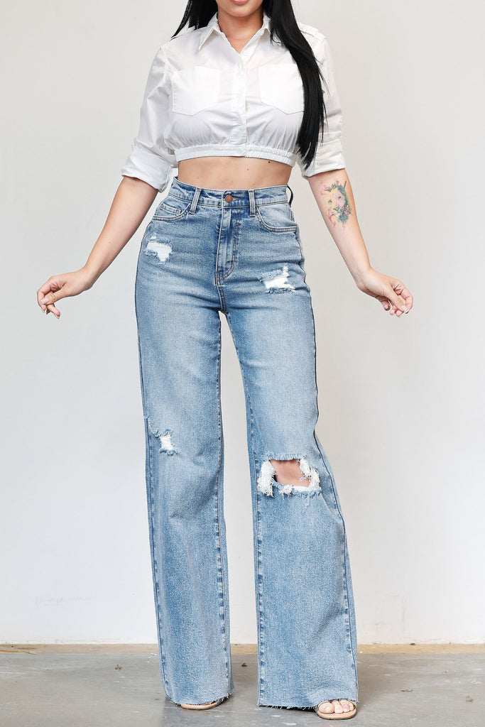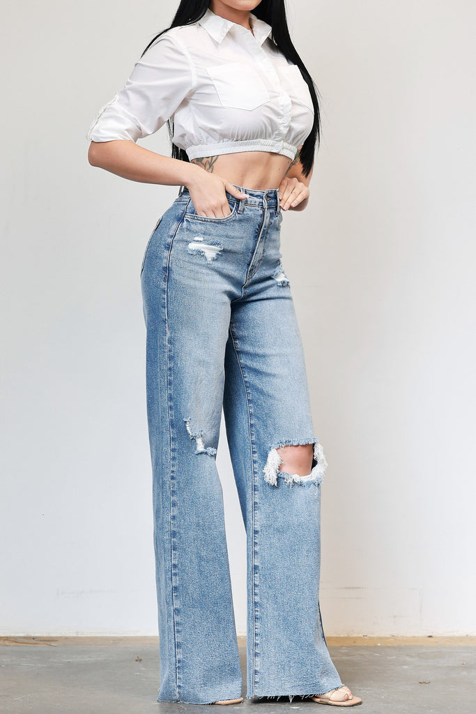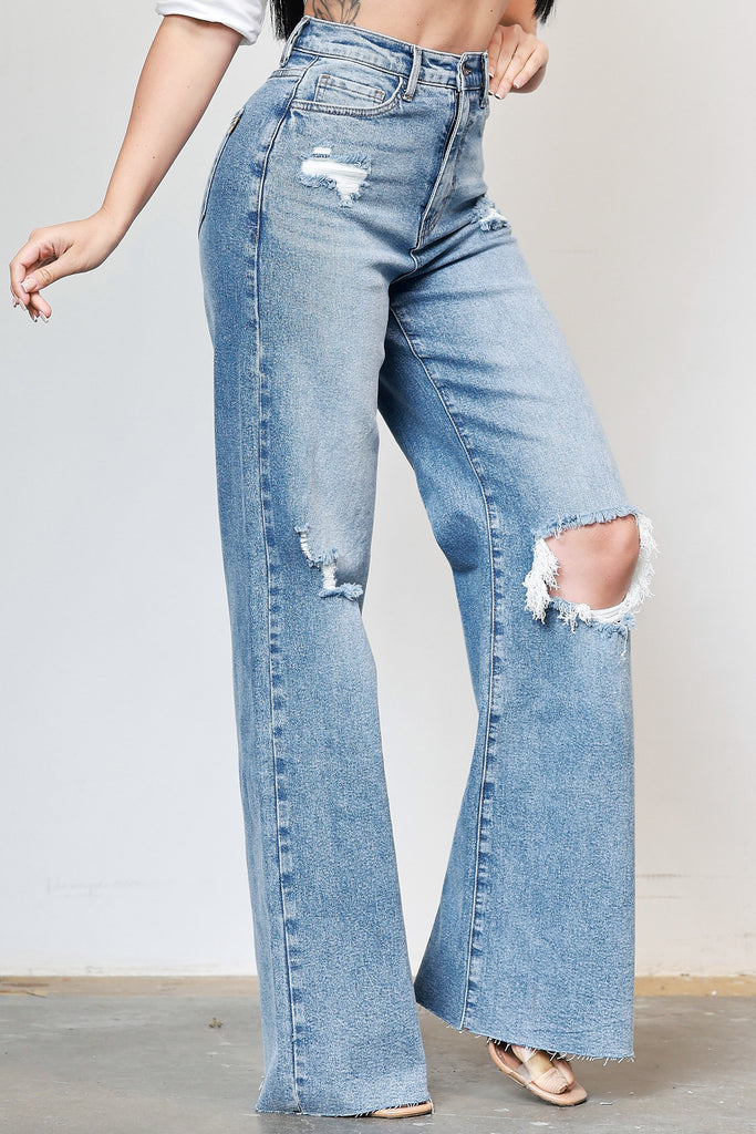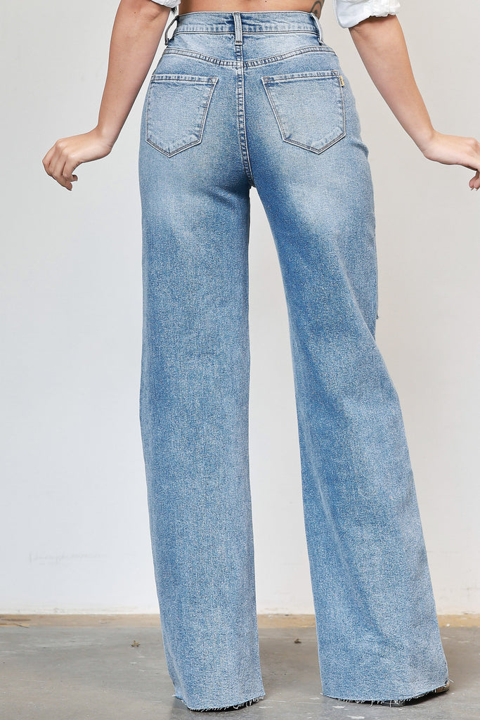 A pair of high-rise wide fit jeans featuring classic 5-pocket construction, small distressed details, raw edge hem, and zip-fly closure.