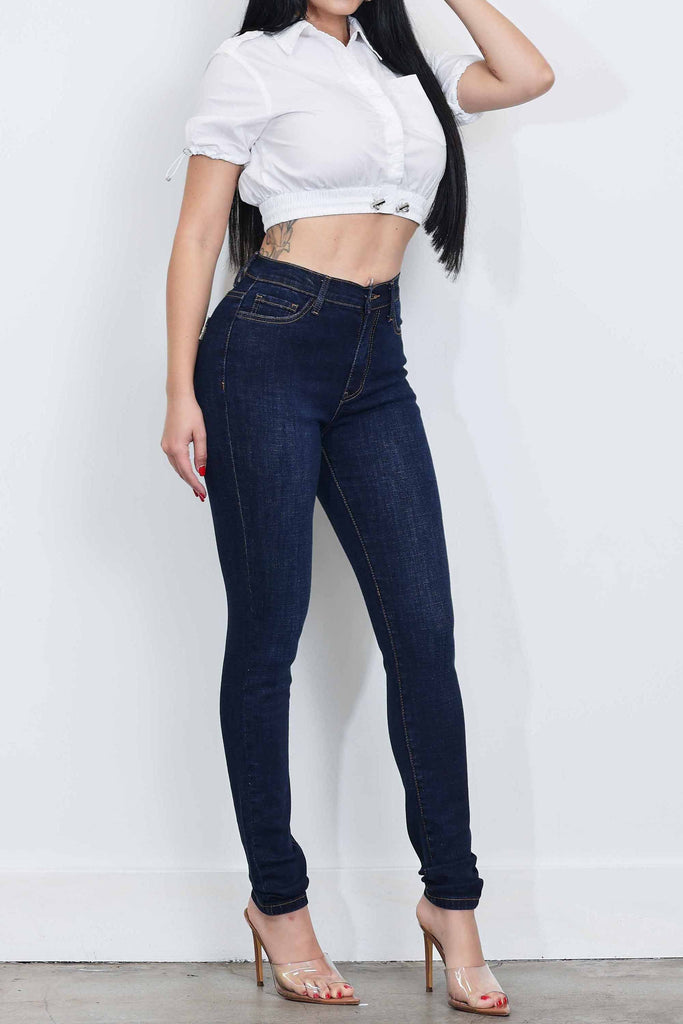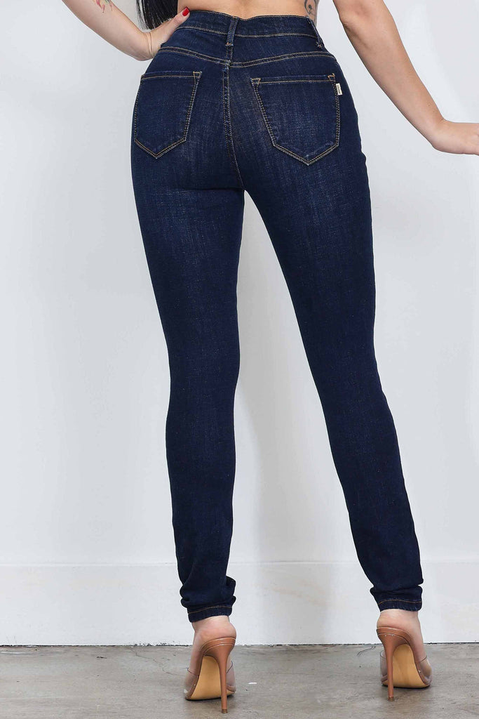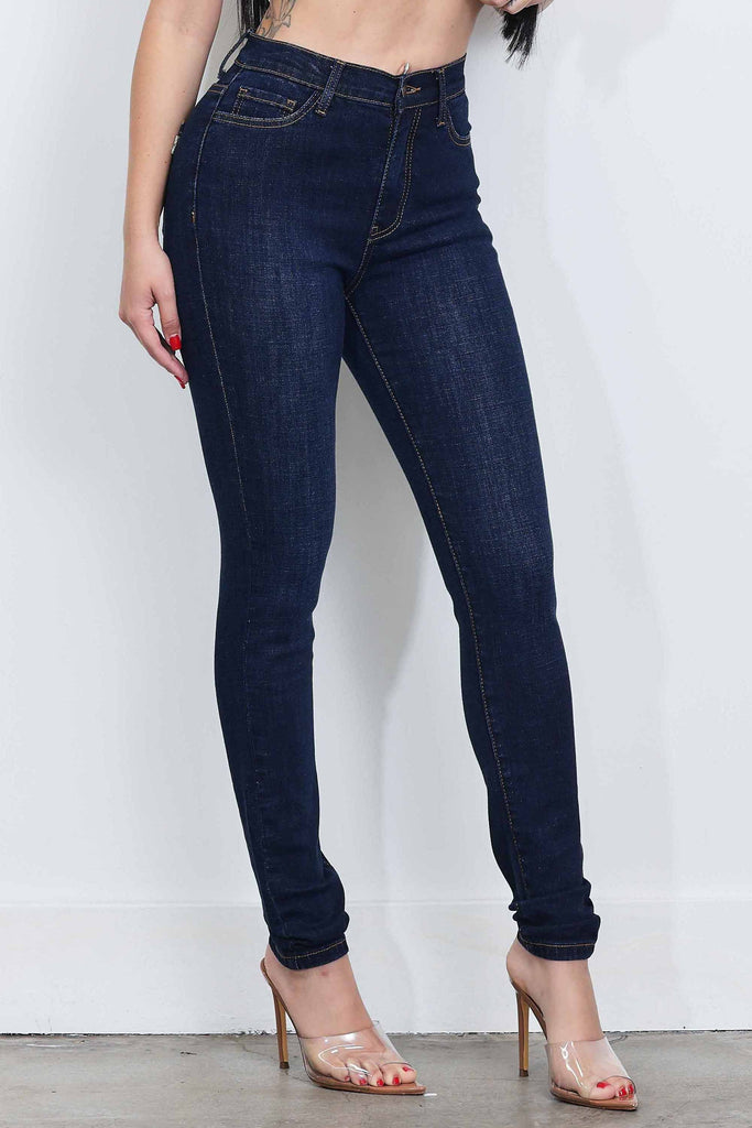 A pair of high-rise skinny jeans featuring classic 5-pocket construction and zip-fly closure.