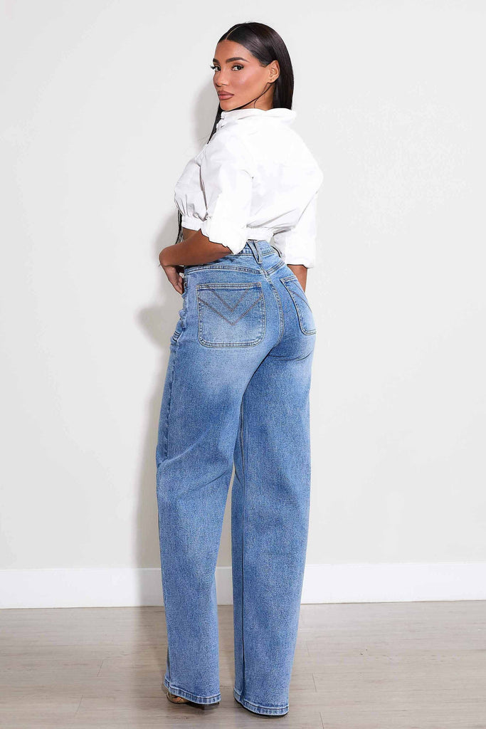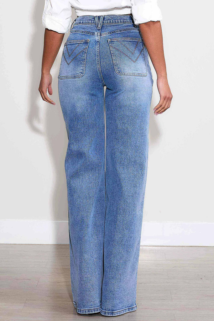 A pair of wide leg jeans featuring front square pockets, back pockets and a zip-fly closure.