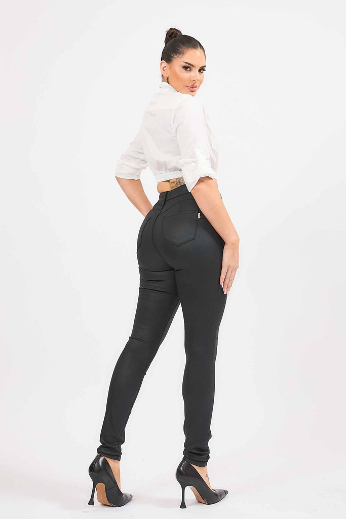 A pair of coated skinny jeans featuring faux front pockets, back pockets and a zip-fly closure.