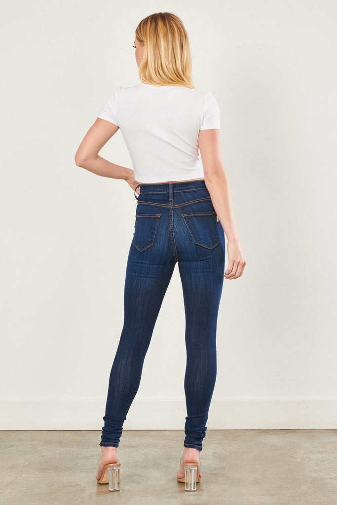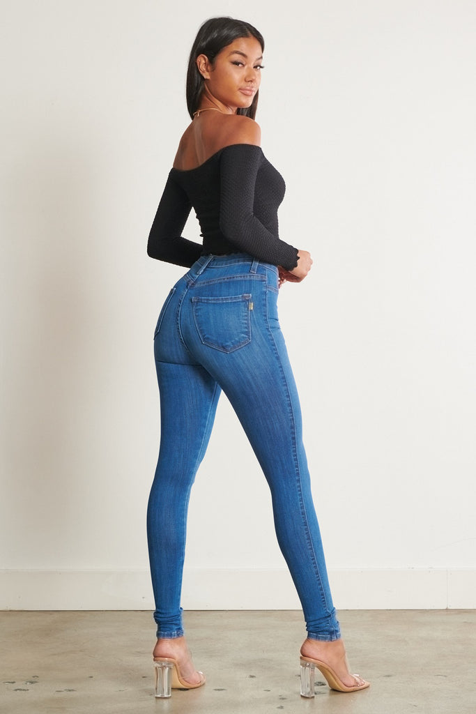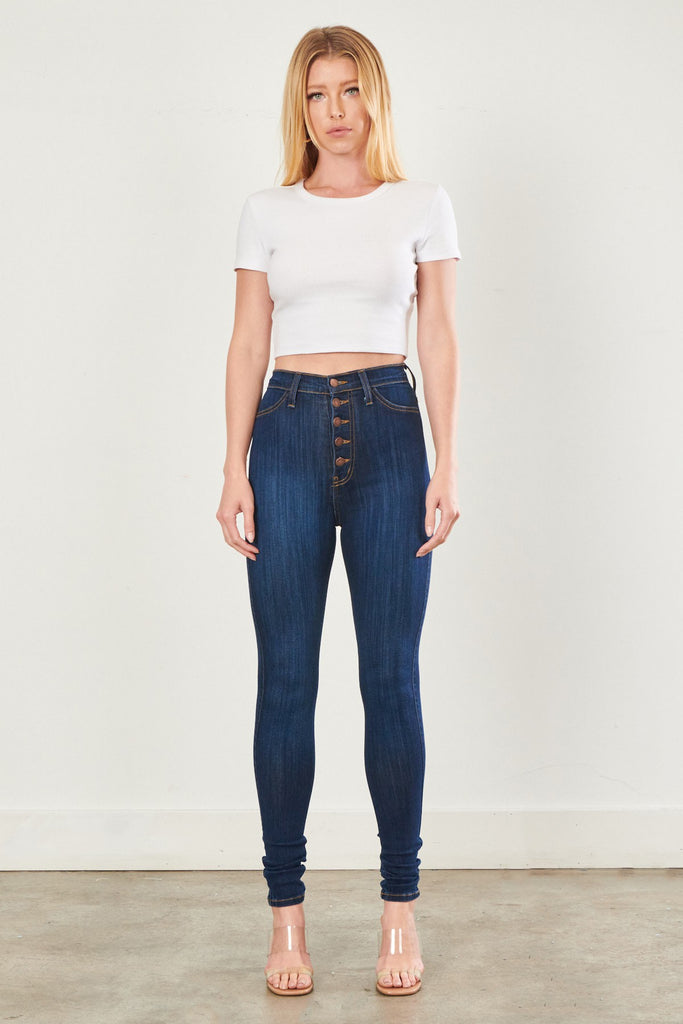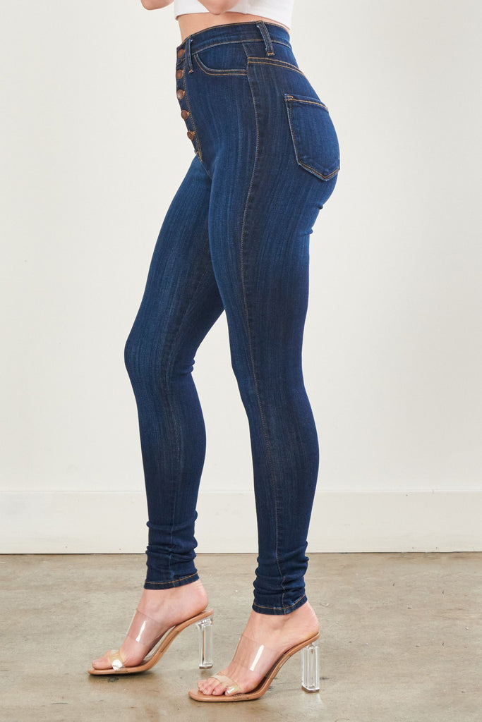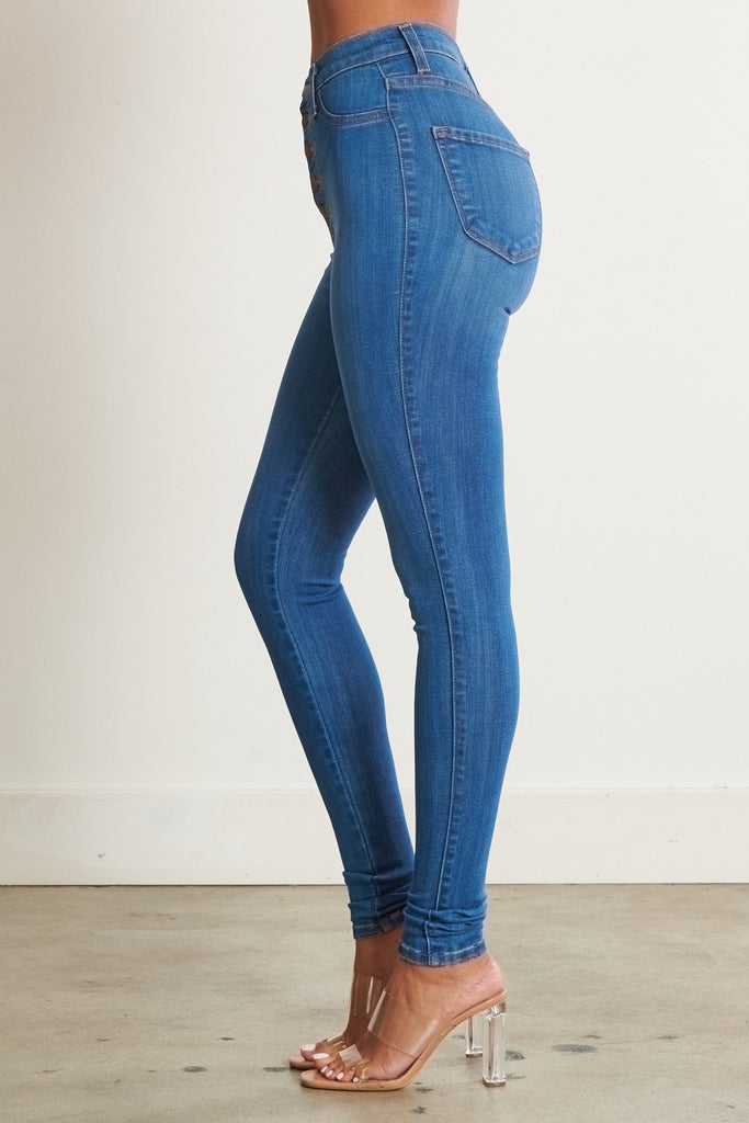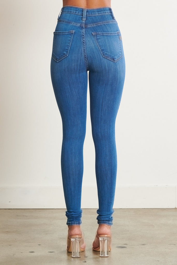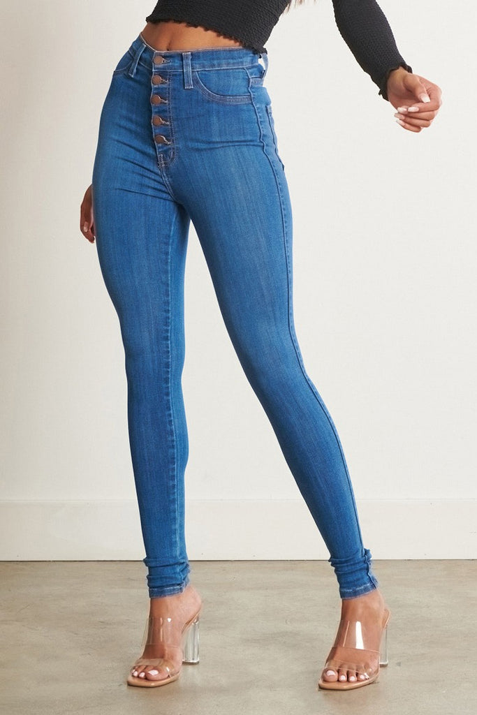 A pair of high-waisted skinny jeans featuring a 5-button closure and 2 back patch pockets.