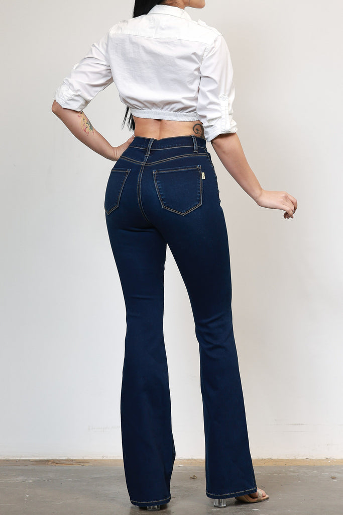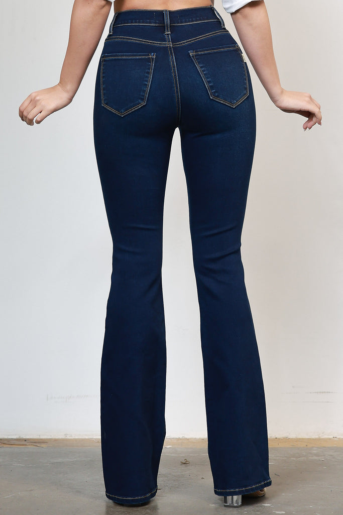 A pair of bootcut jeans featuring a 5-Pocket construction and a zip-fly closure.