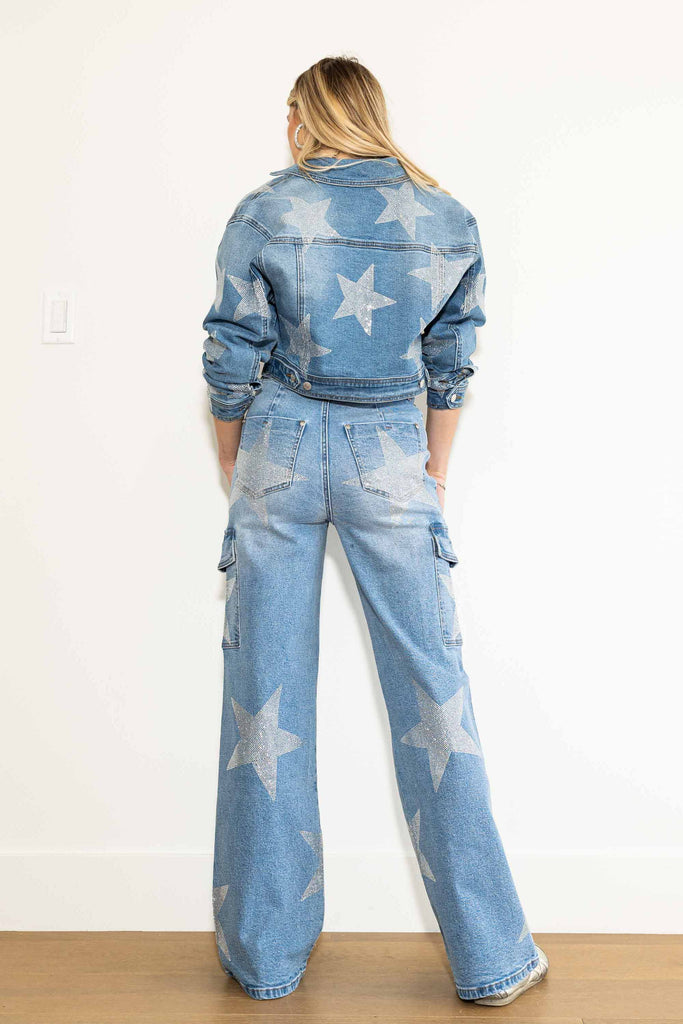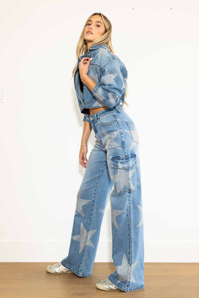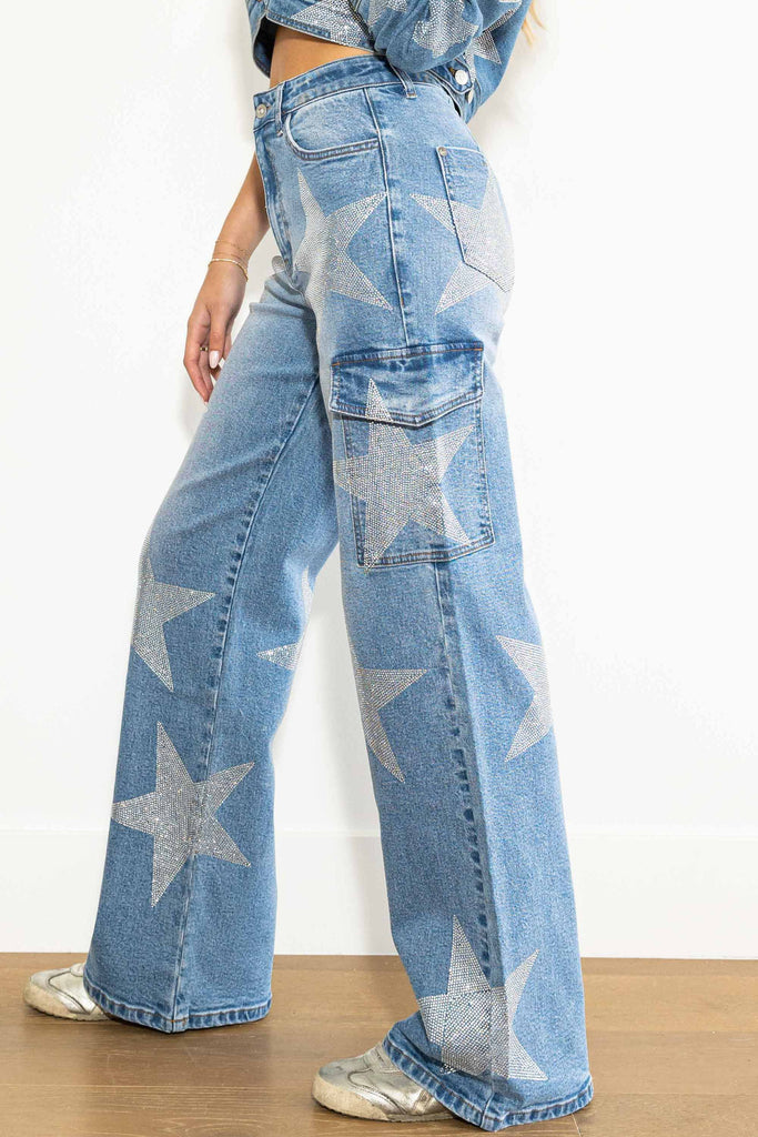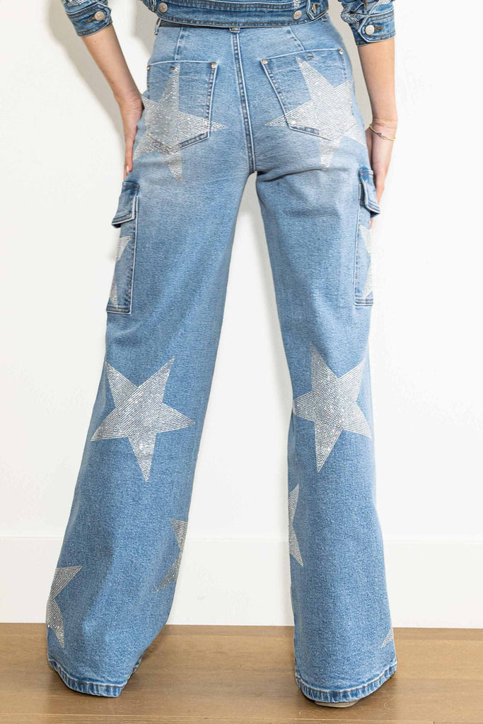 A pair of wide cargo jeans featuring star shape rhinestone detail, cargo pockets, a 5-Pocket construction and zip-fly closure.