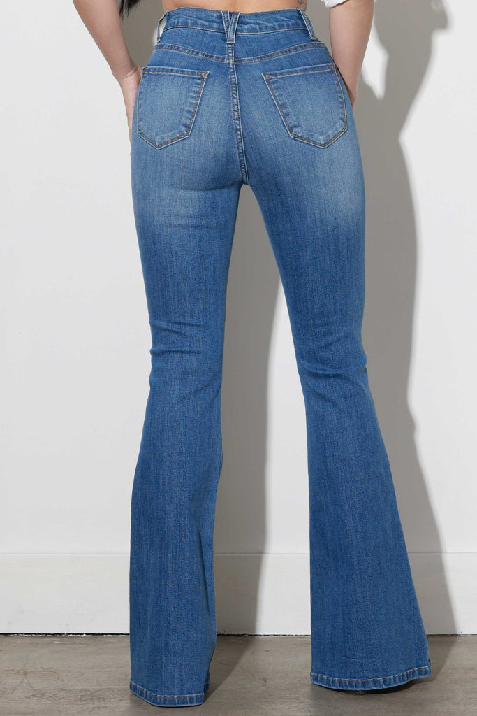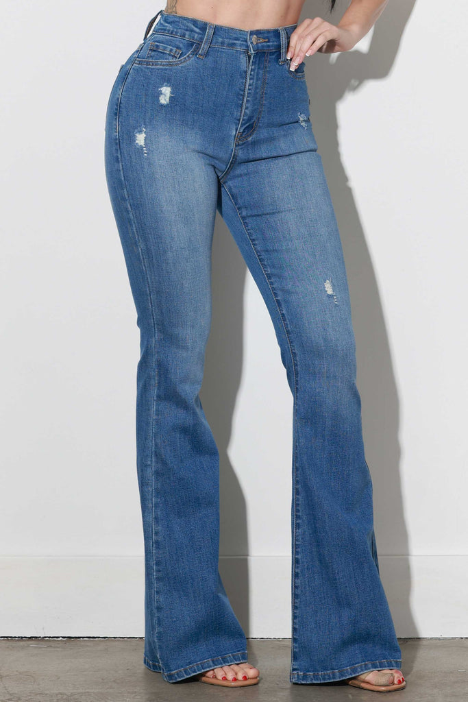 A pair of flare jeans featuring subtle distress, classic 5-pocket construction and a zip-fly closure.