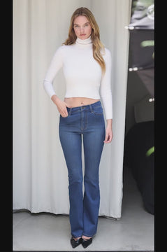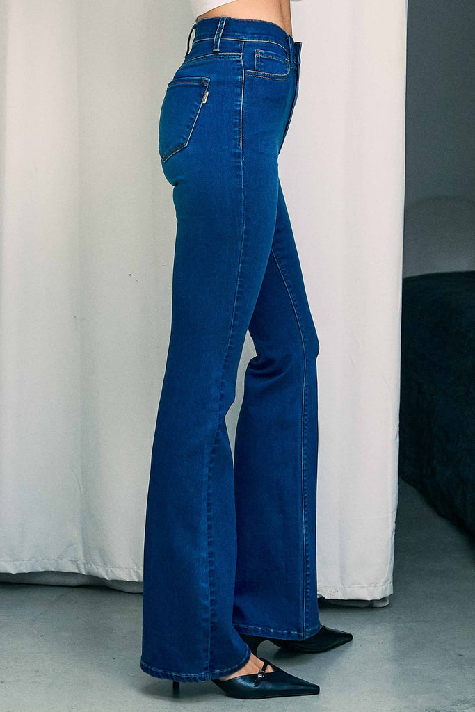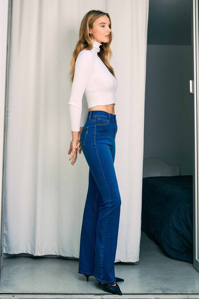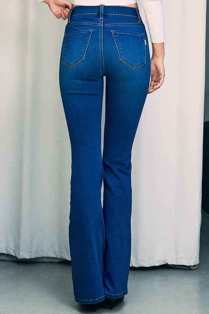 A pair of bootcut jeans featuring a 5-Pocket construction and a zip-fly closure.