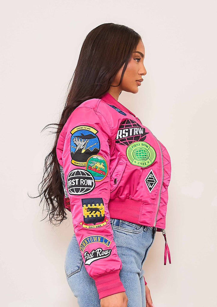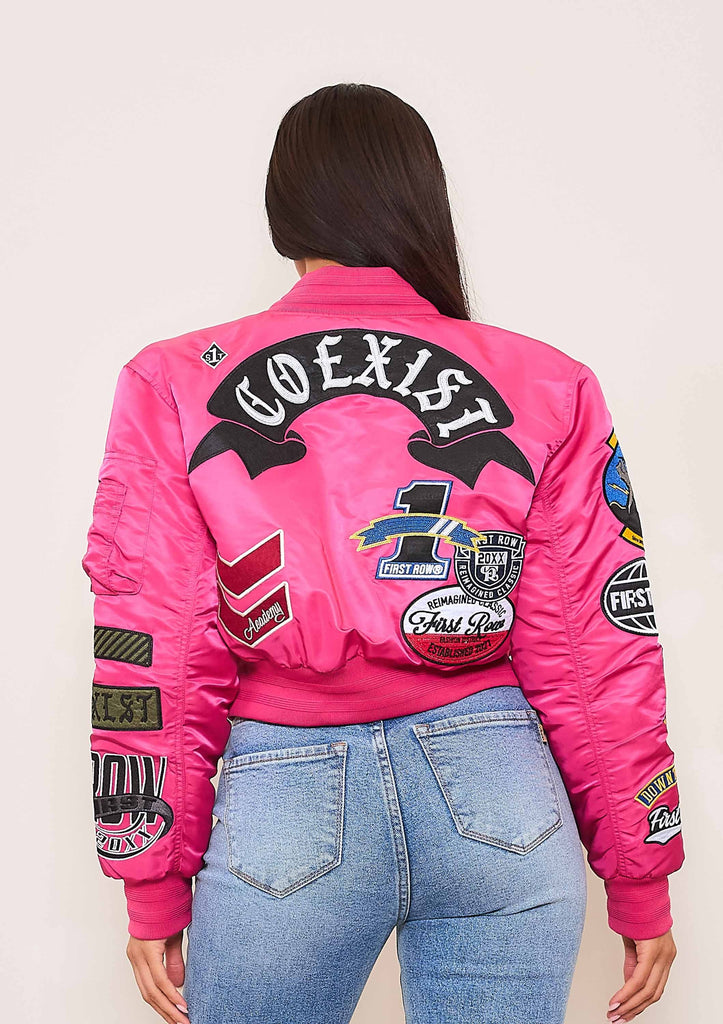 A comfy oversized MA-1 bomber jacket with utility detail. Featuring a rib-knit banding at the cuffs hem for a comfortable fit with warm quilting inside lining and center front zipper closure.