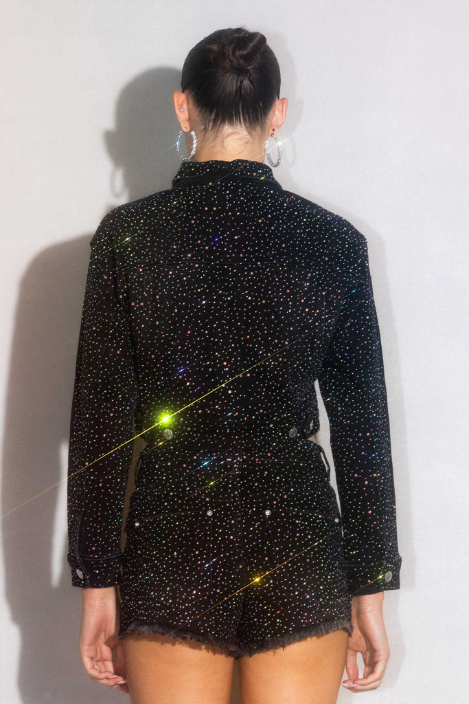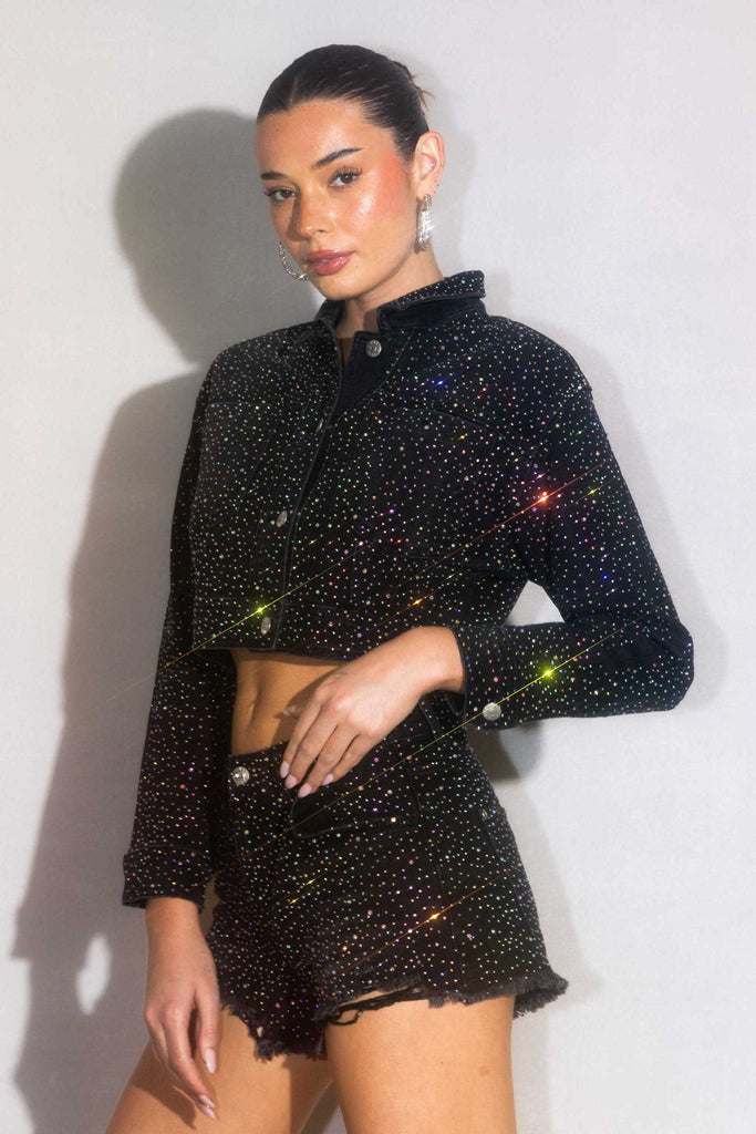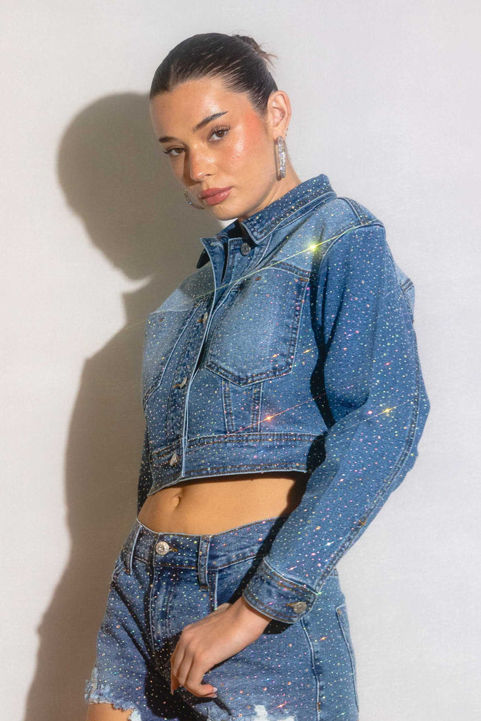 A cropped denim jacket features all over rhinestone detail, two front patch pockets and a button-up closure.