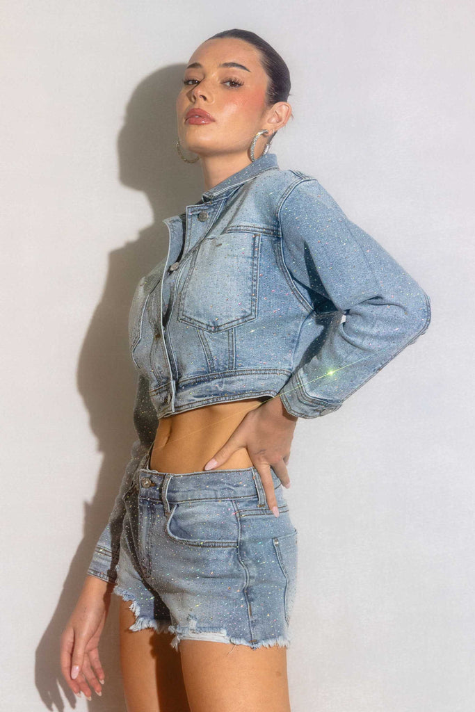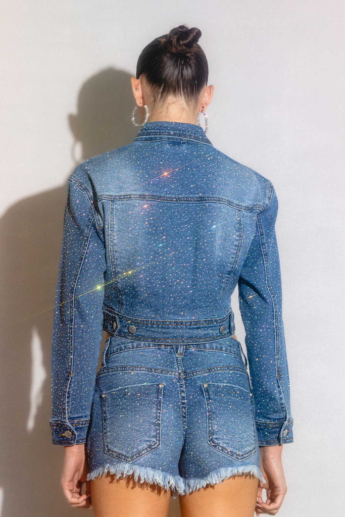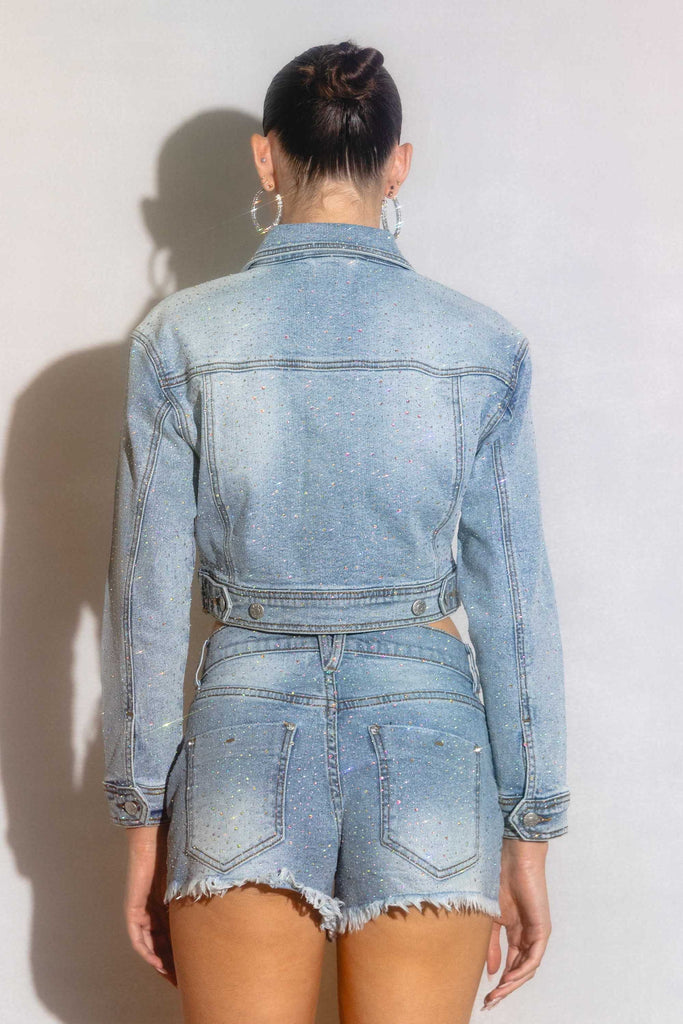 [XJK060] Rhinestone Studded Cropped Denim Jacket