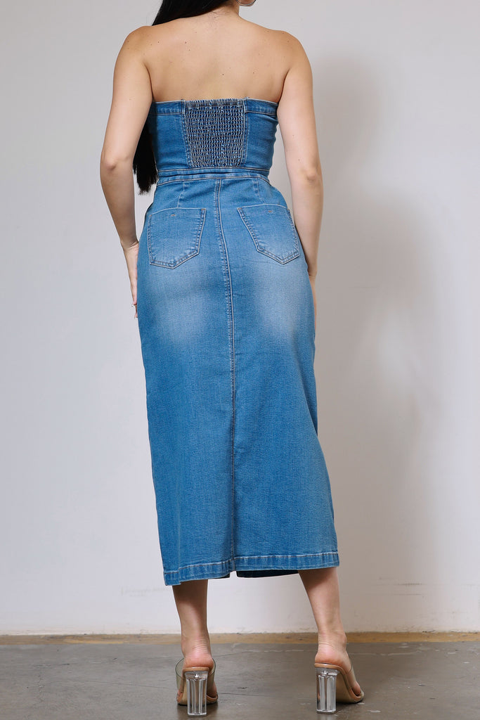A denim midi dress featuring smocking back, 5-Pocket construction and button-up closure.