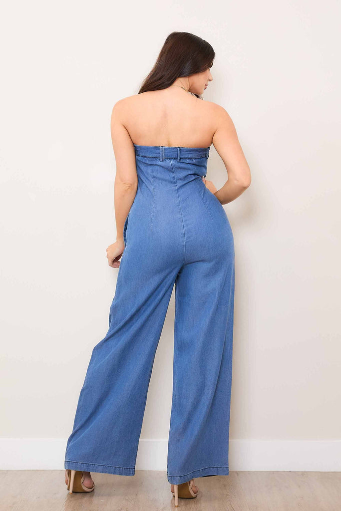An off shoulder jumpsuit featuring the belt loop & detachable belt on the chest, side pockets and a zip-fly closure.