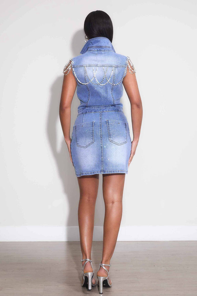 A sleeve-less denim dress featuring tear drop rhinestone & pearl detail, all over rhinestone, chest pockets, a classic 5-pocket construction and a zip-fly closure.
