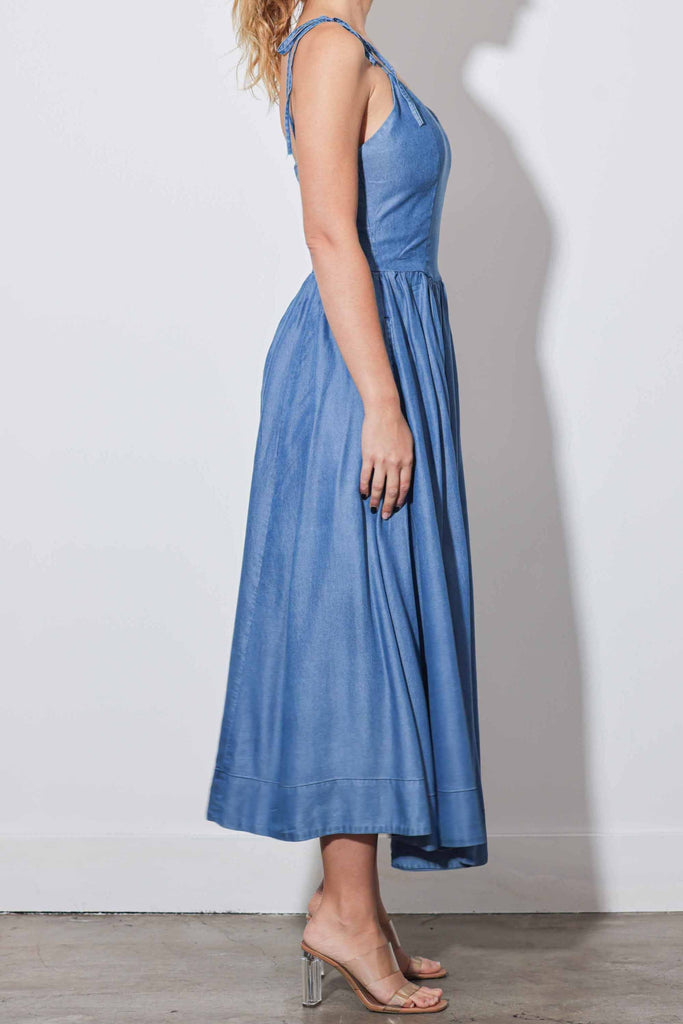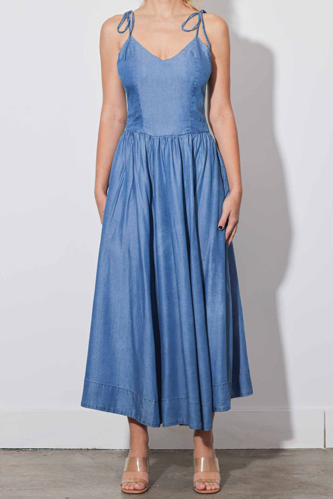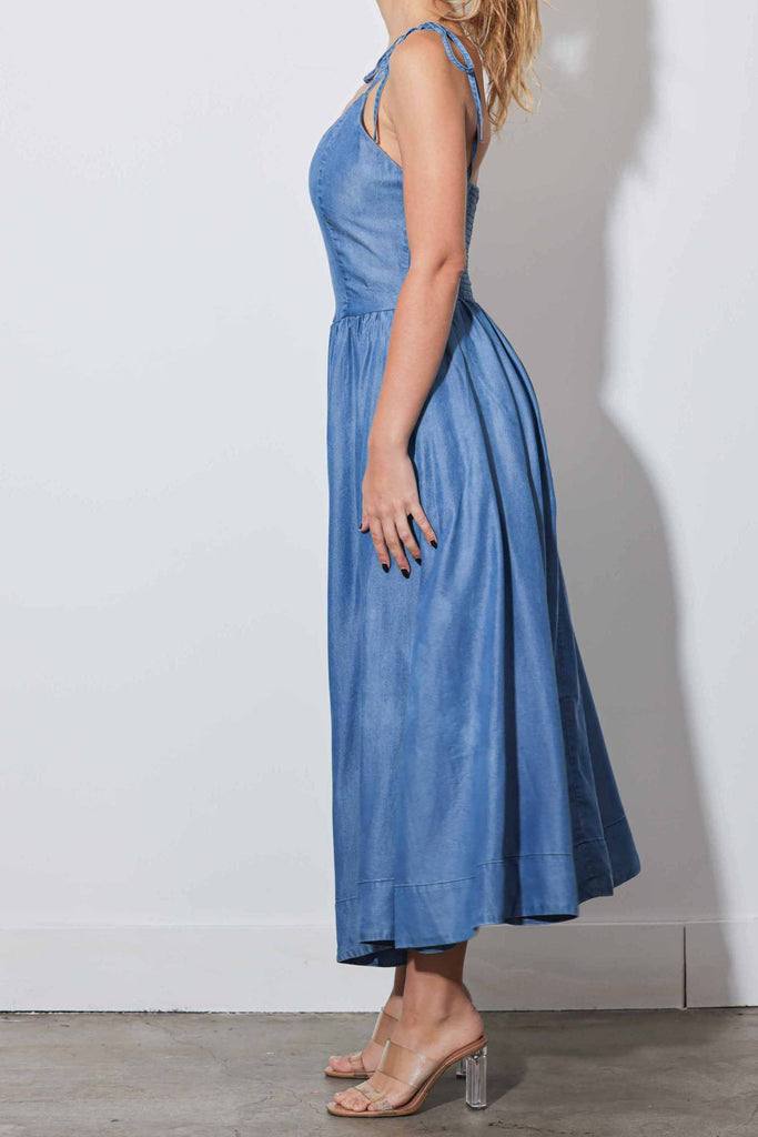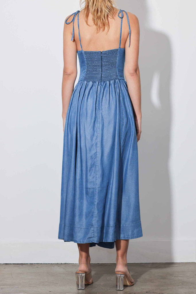 A full dress featuring spaghetti strap shoulders, front pockets, smocking back with a zip fly closure.