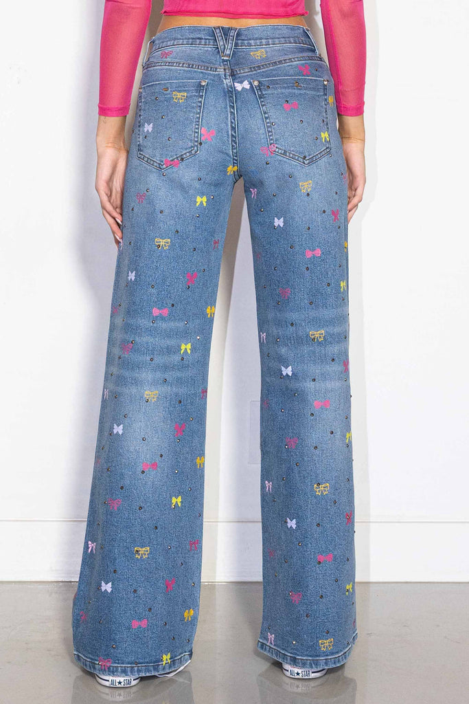 A pair of mid-rise wide jeans featuring cute ribbon graphic prints, rhinestone detail, classic 5-pocket construction and zip-fly closure.