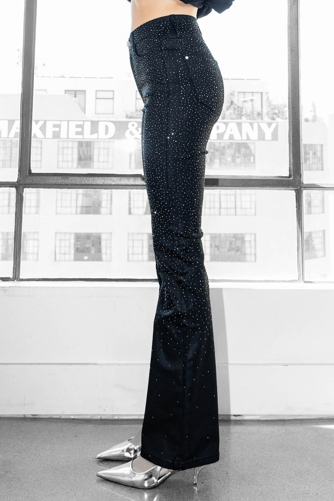 A pair of bootcut jeans featuring all over rhinestone, a classic 5-pocket construction and a zip-fly closure.