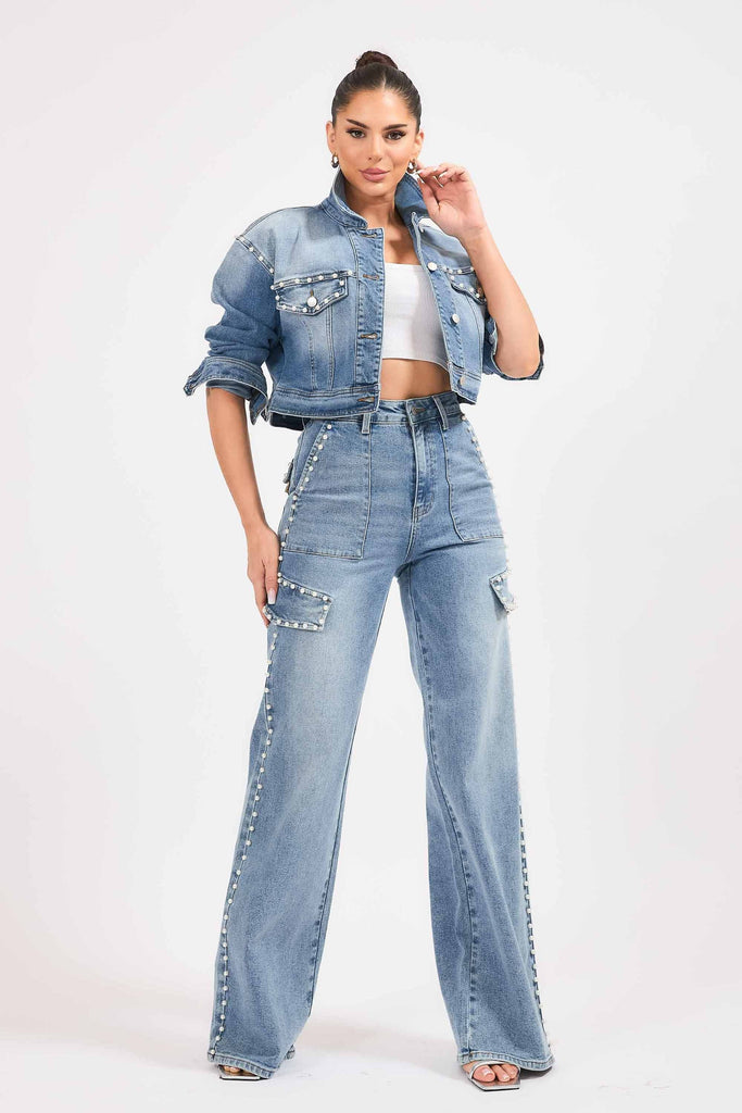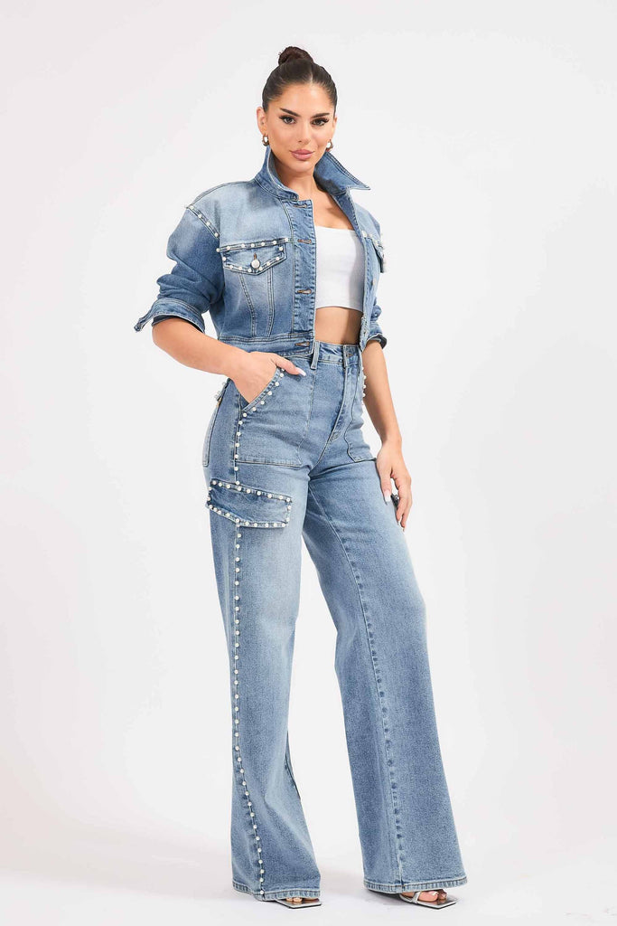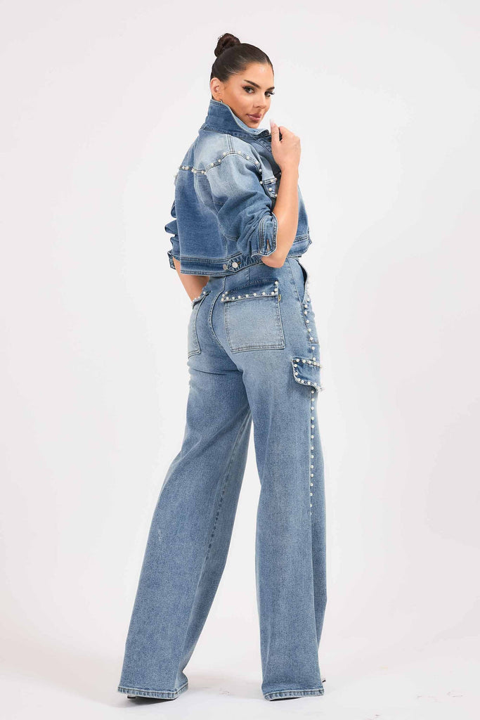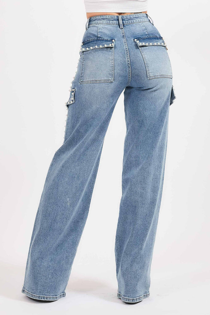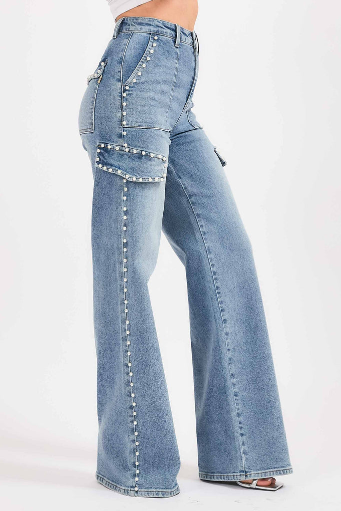 A pair of cargo wide leg jeans featuring pearl details, cargo pockets, front & back pockets and a zip-fly closure.