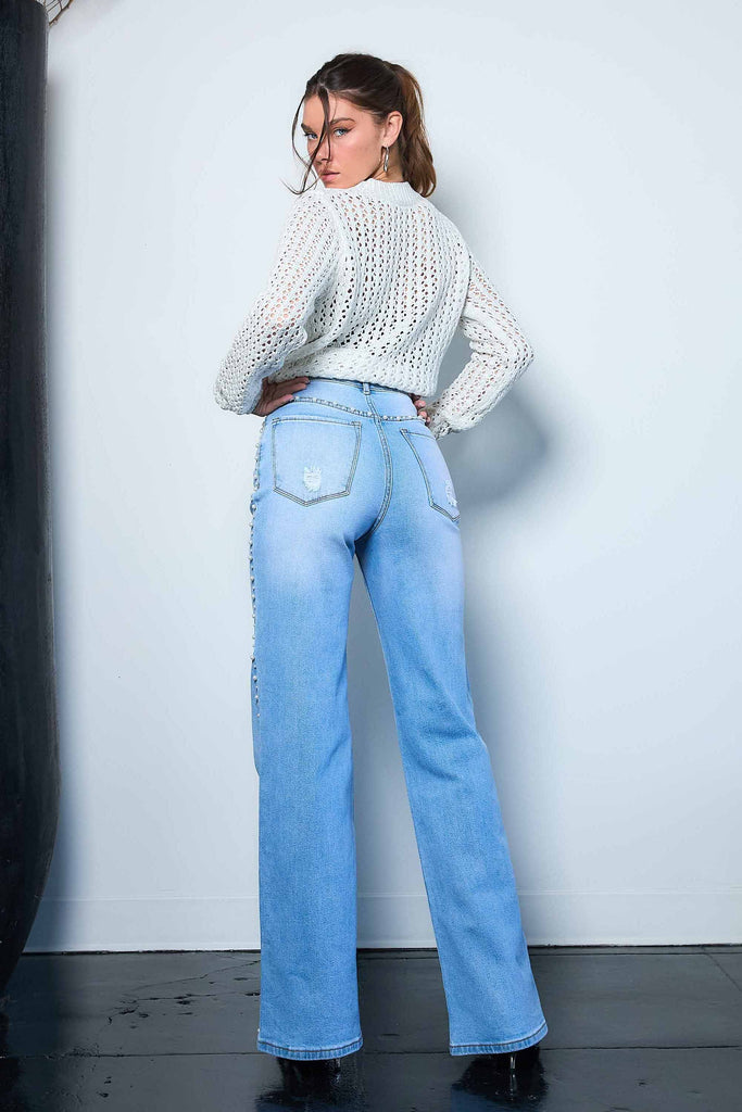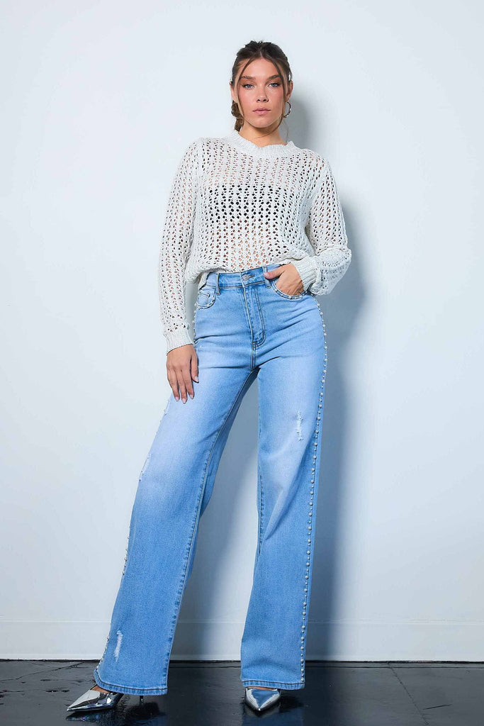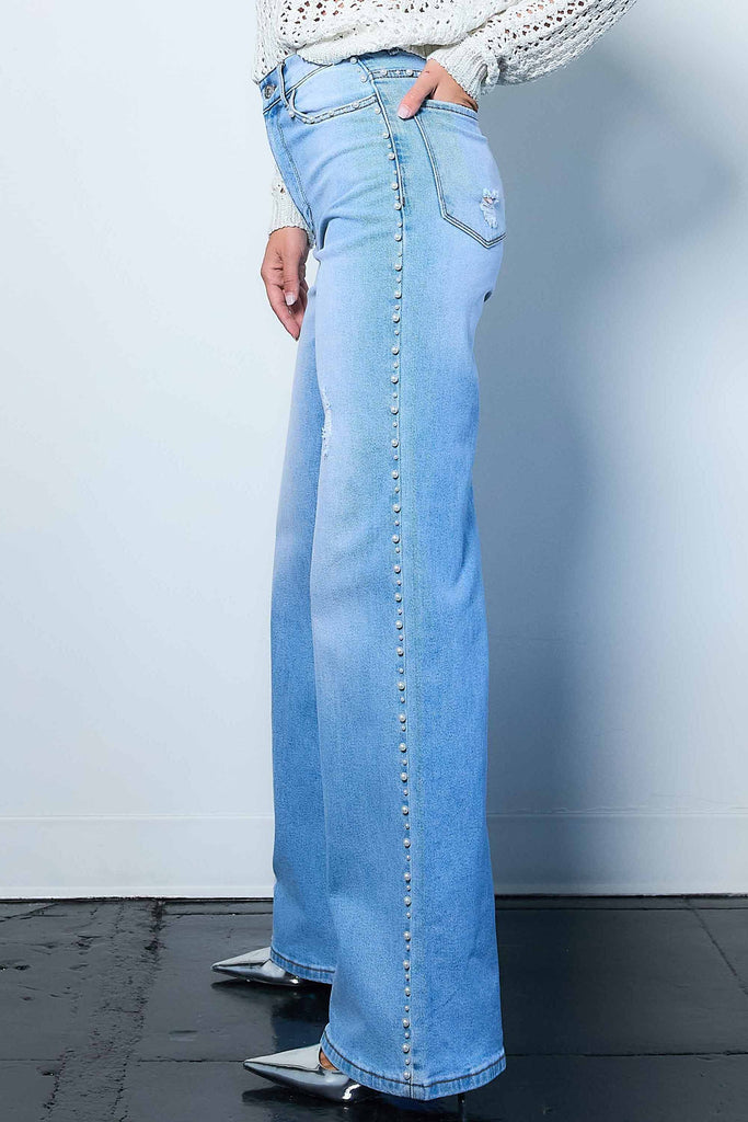 A pair of high-rise wide leg jeans featuring pearl details, subtle distress, classic 5-pocket construction and a zip-fly closure.