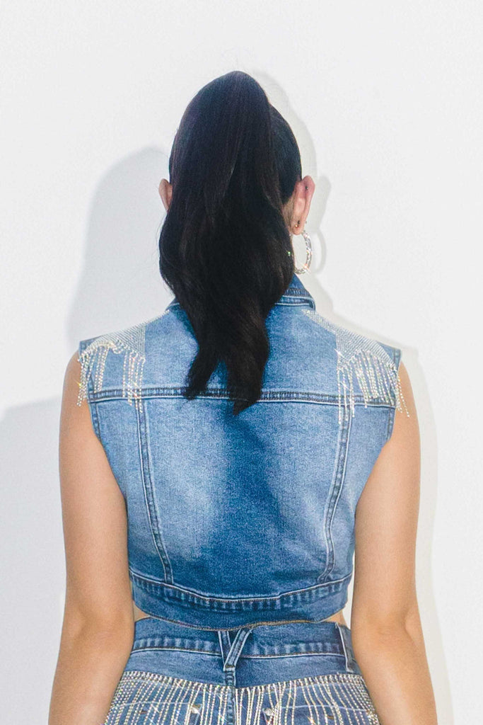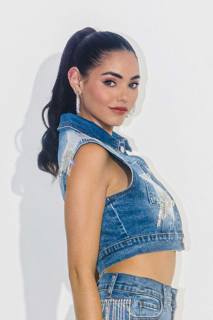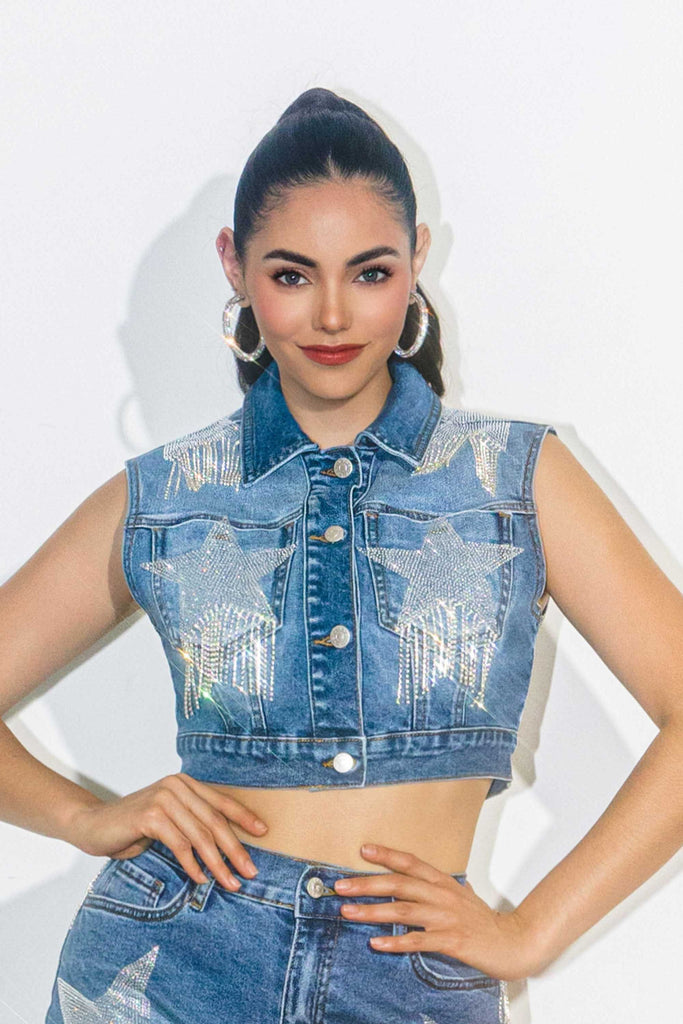 A sleeve-less denim trucker jacket featuring star iridescent rhinestone with tear drop details, chest pockets and a button-up closure.