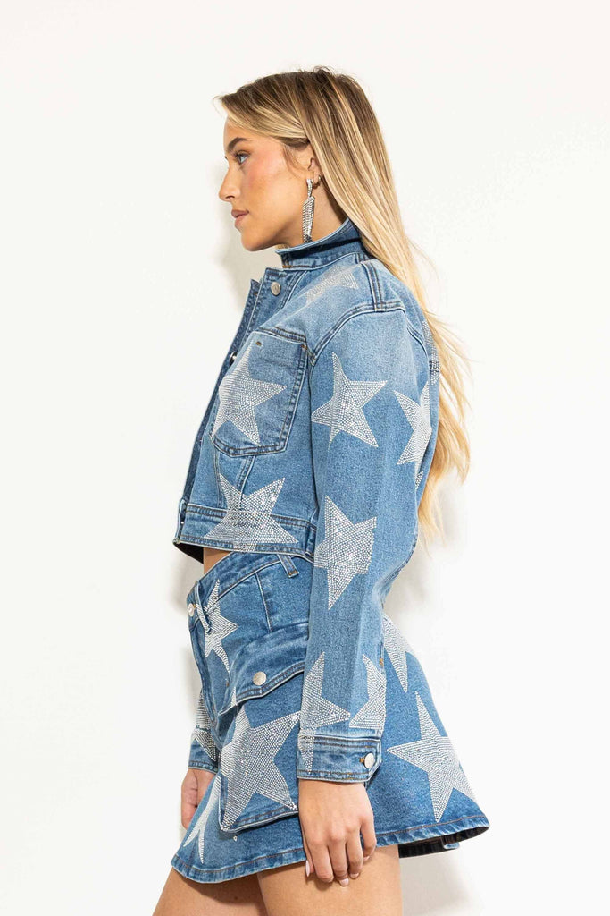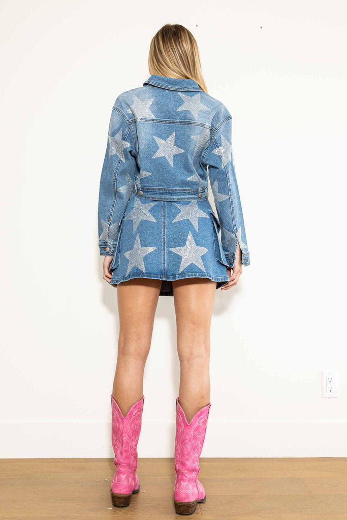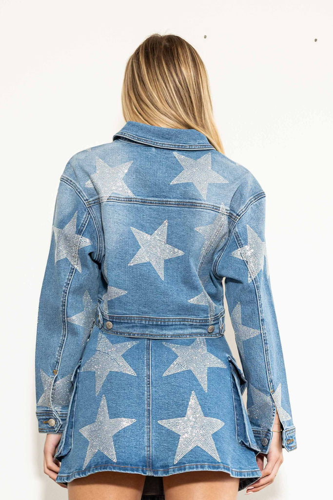 A denim jacket features star shape rhinestone detail, two front patch pockets, and 4 front button closure.