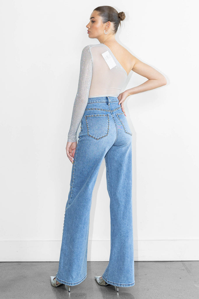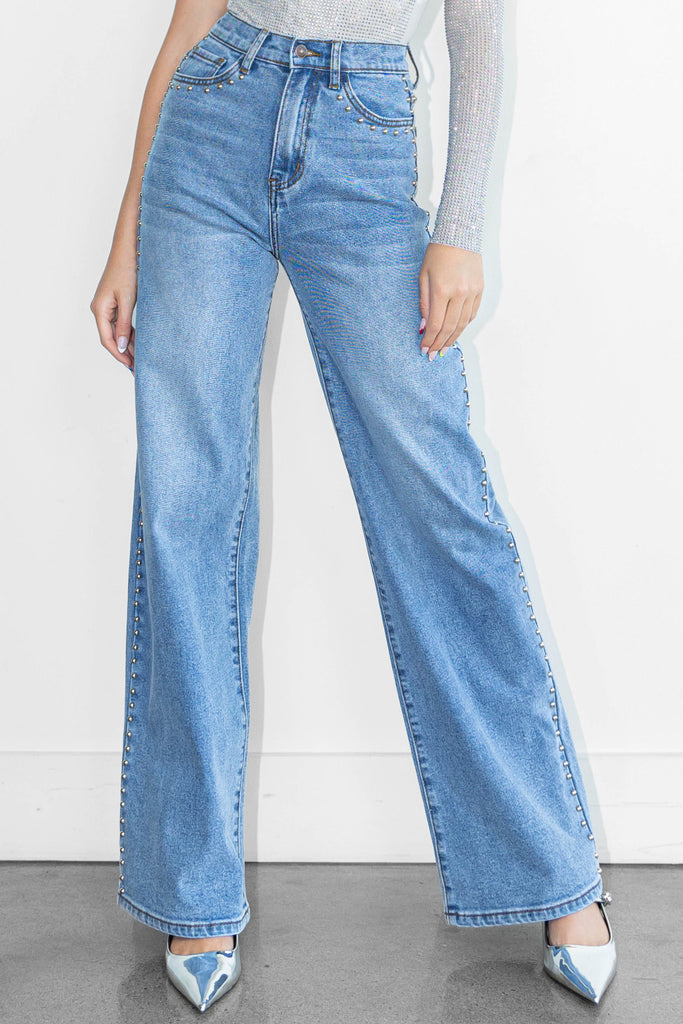 A pair of high-rise wide leg jeans featuring stud details around pockets and side seams, a classic 5-pocket construction and a zip-fly closure.