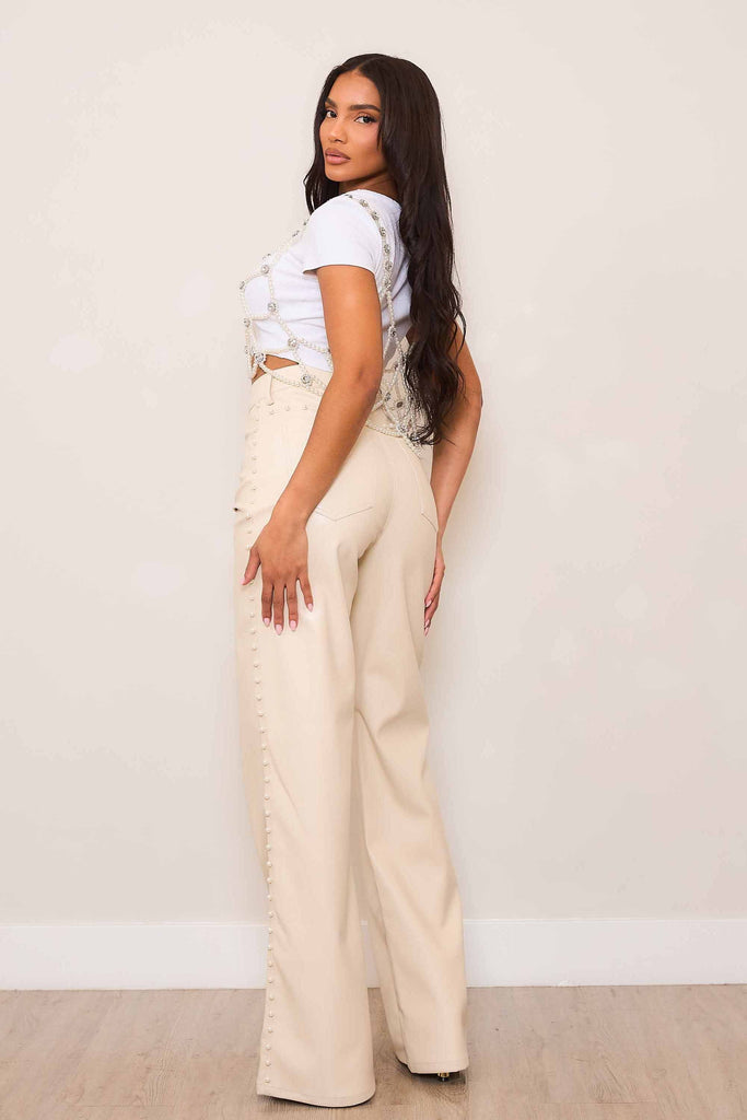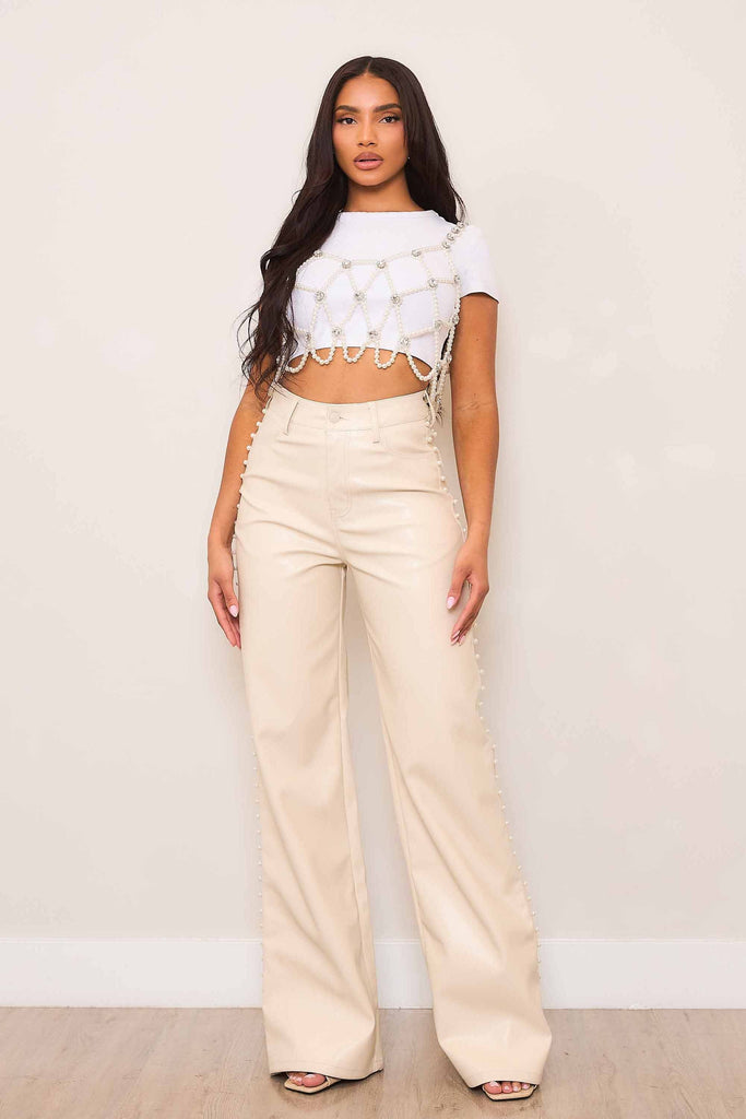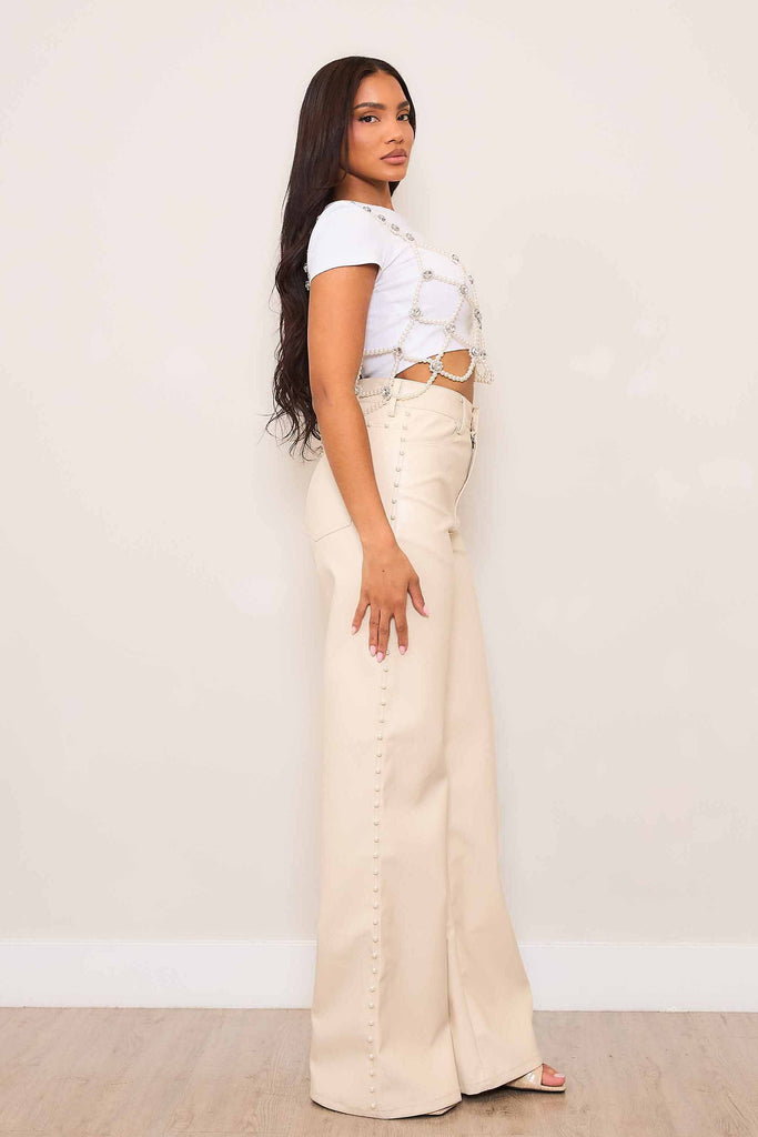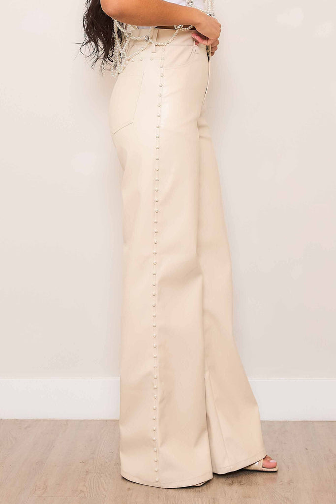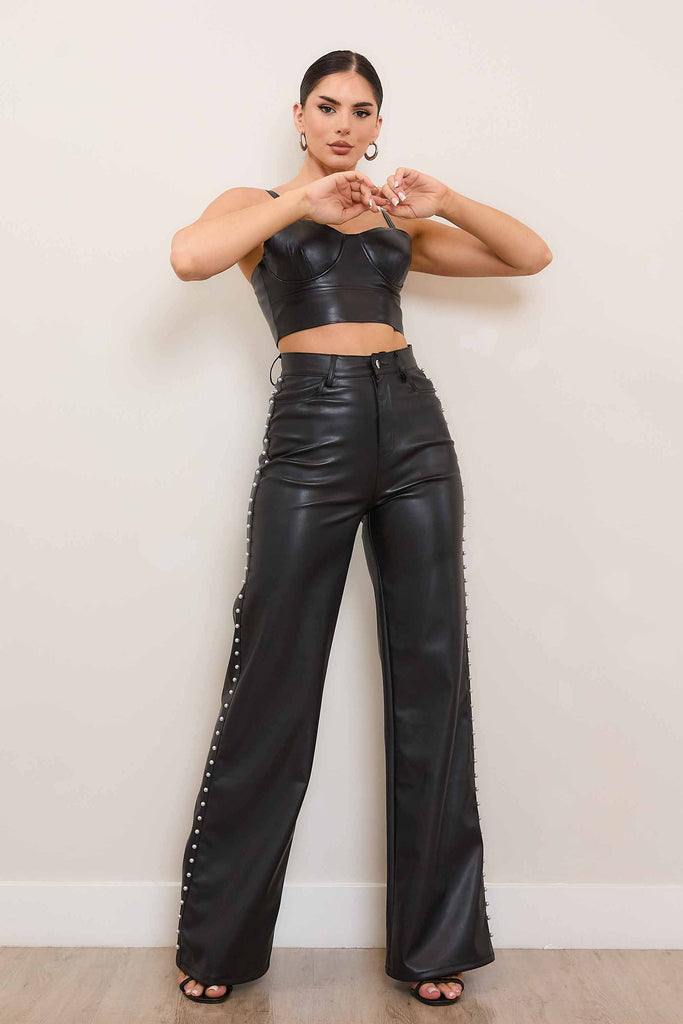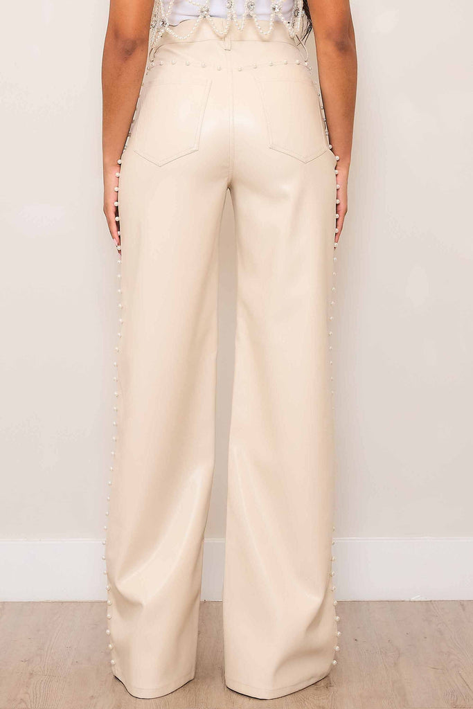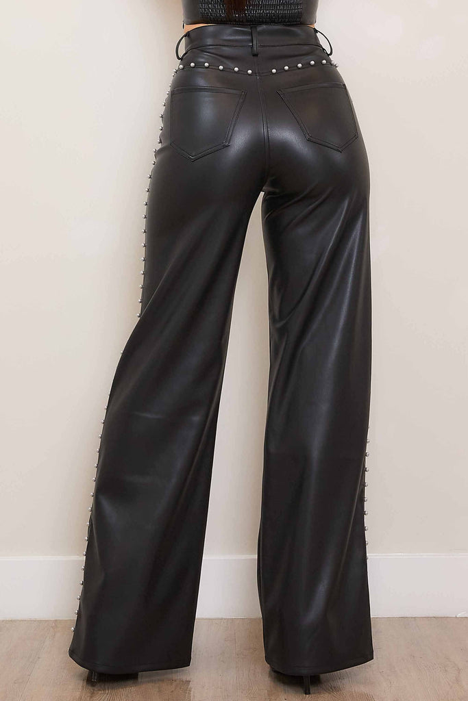 A pair of faux leather wide leg pants featuring pearl details, faux front pocket, back pockets and a zip-fly closure.