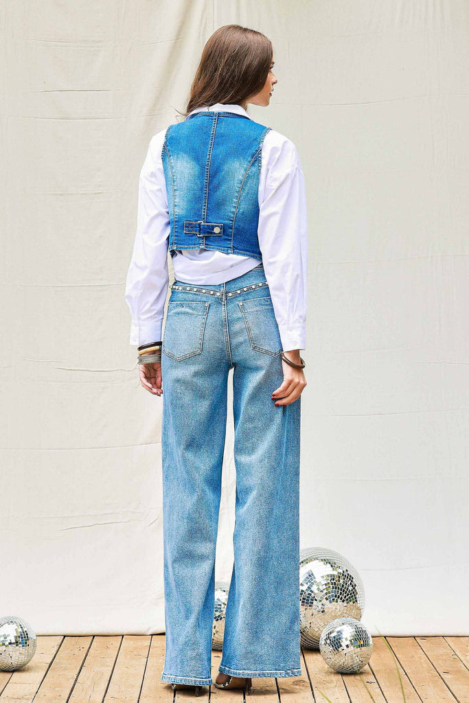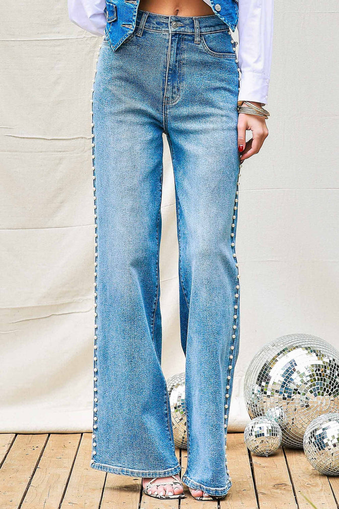 A pair of high-rise wideleg jeans featuring side pearl stud detail, a 5-Pocket construction and zip-fly closure.