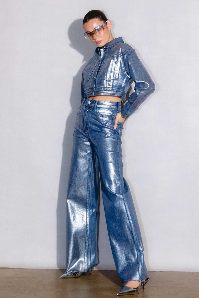 A pair of metallic wide leg jeans featuring raw edge hem leg opening, a 5-Pocket construction and a zip-fly closure.