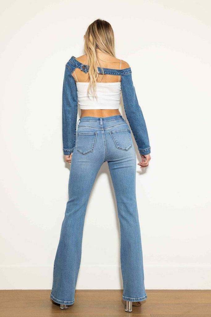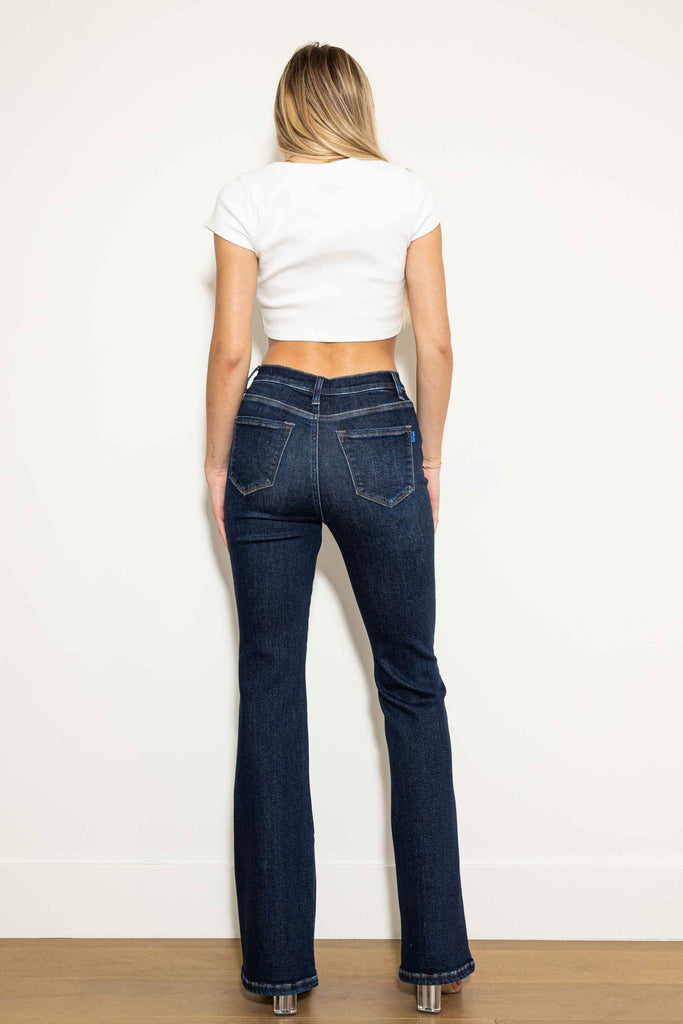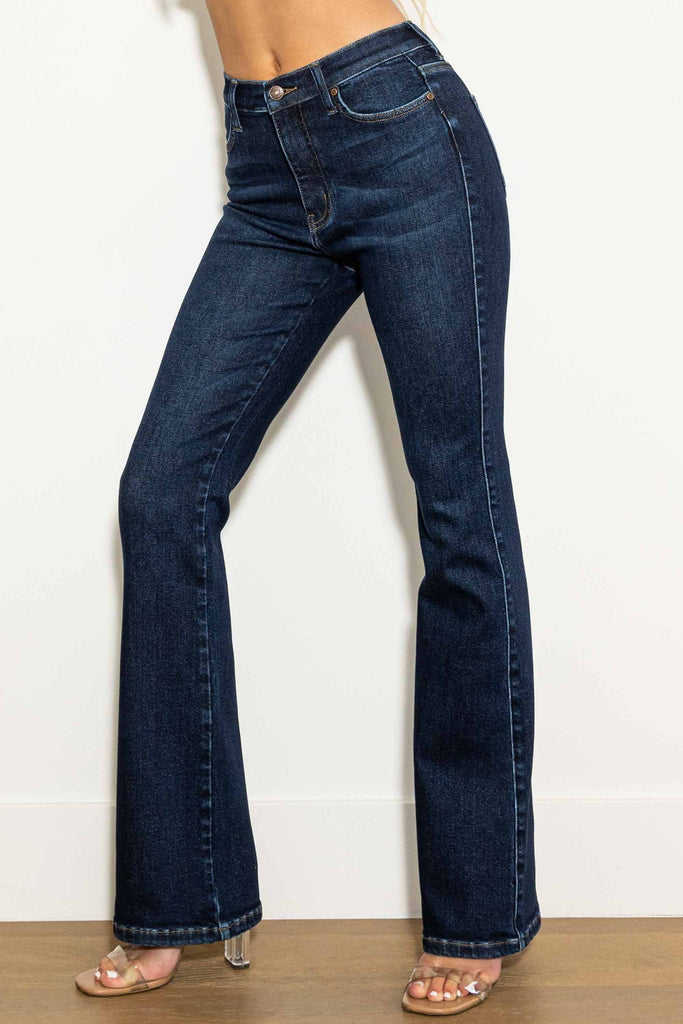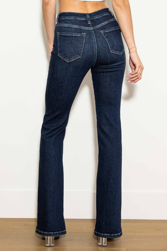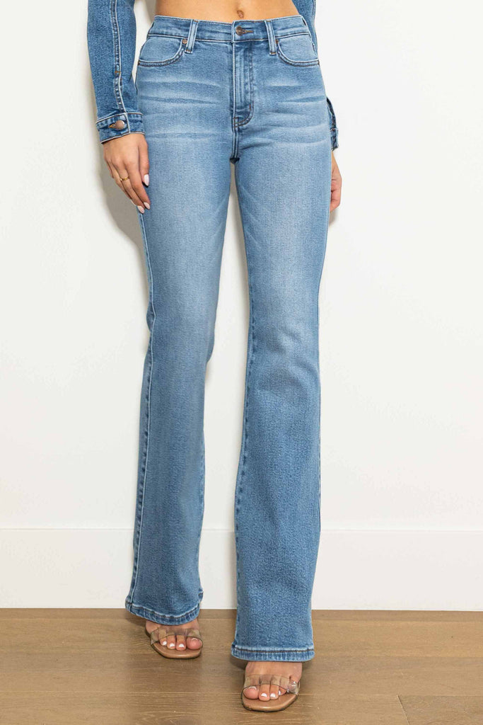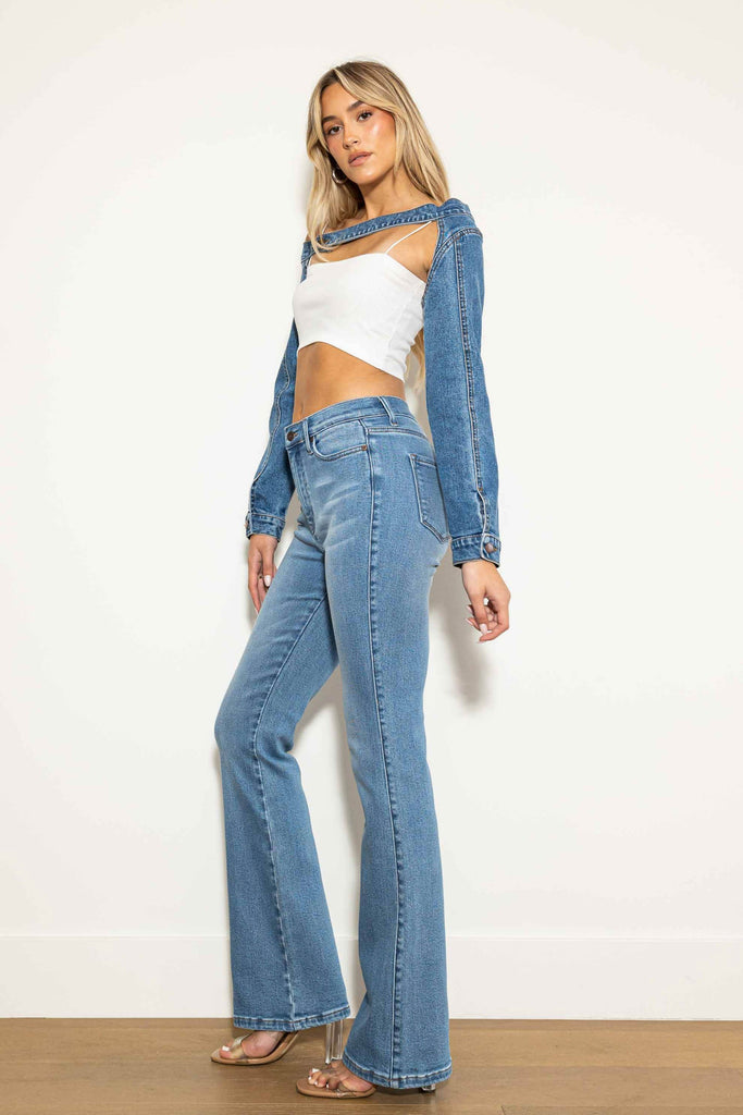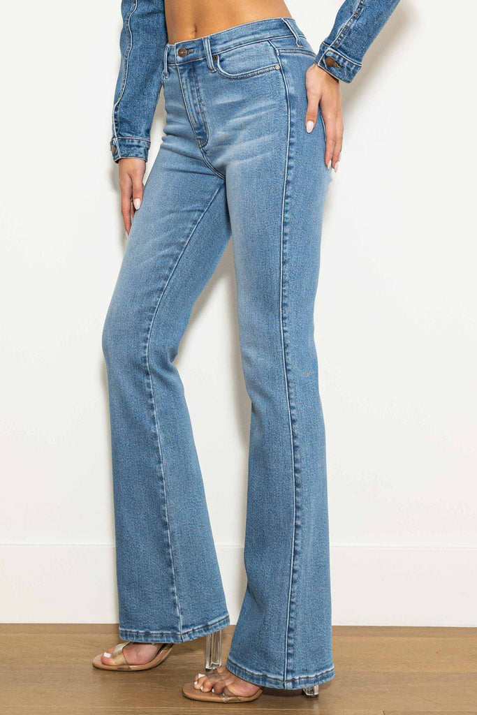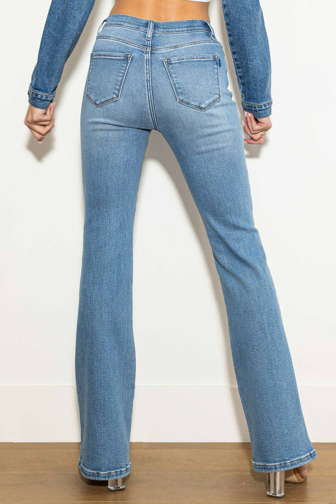 A pair of mid-rise bootcut jeans featuring front & back pockets and zip-fly closure.