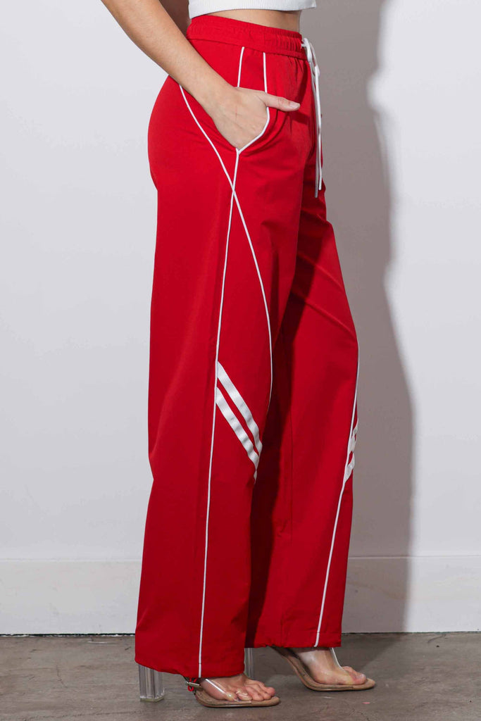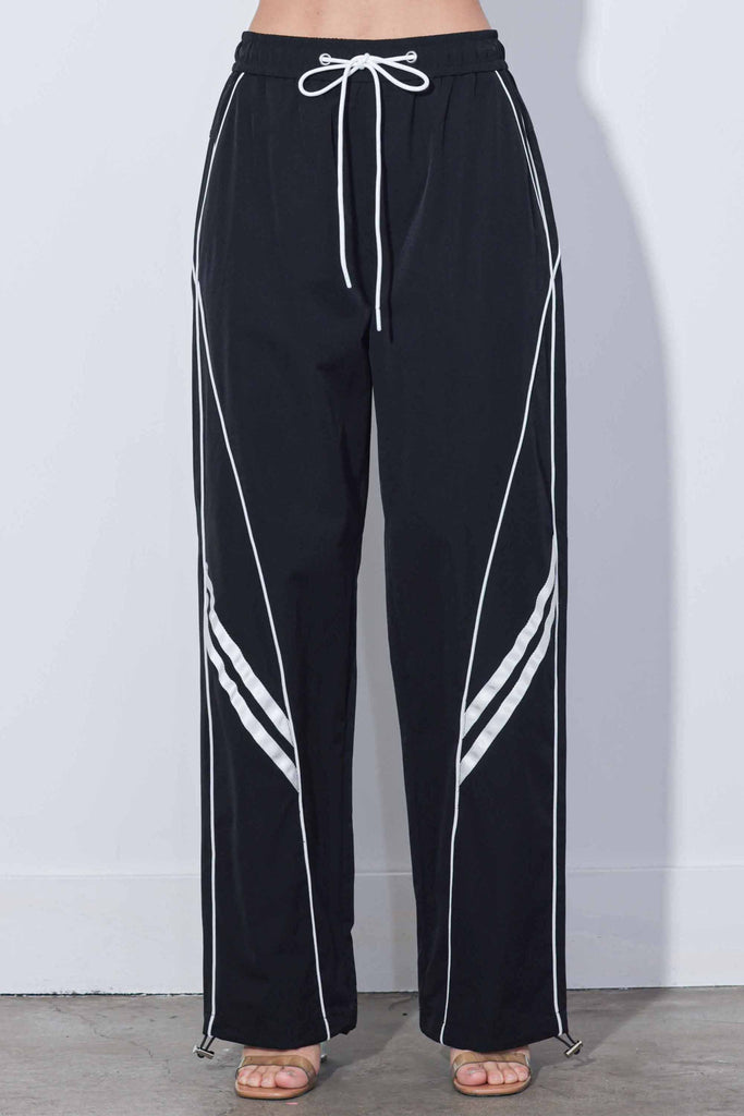 A pair of baggy track pants featuring elastic waist with drawstring, adjustable leg opening with drawstring and front pockets.