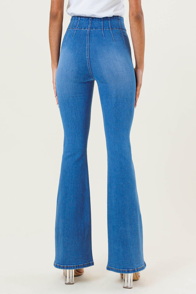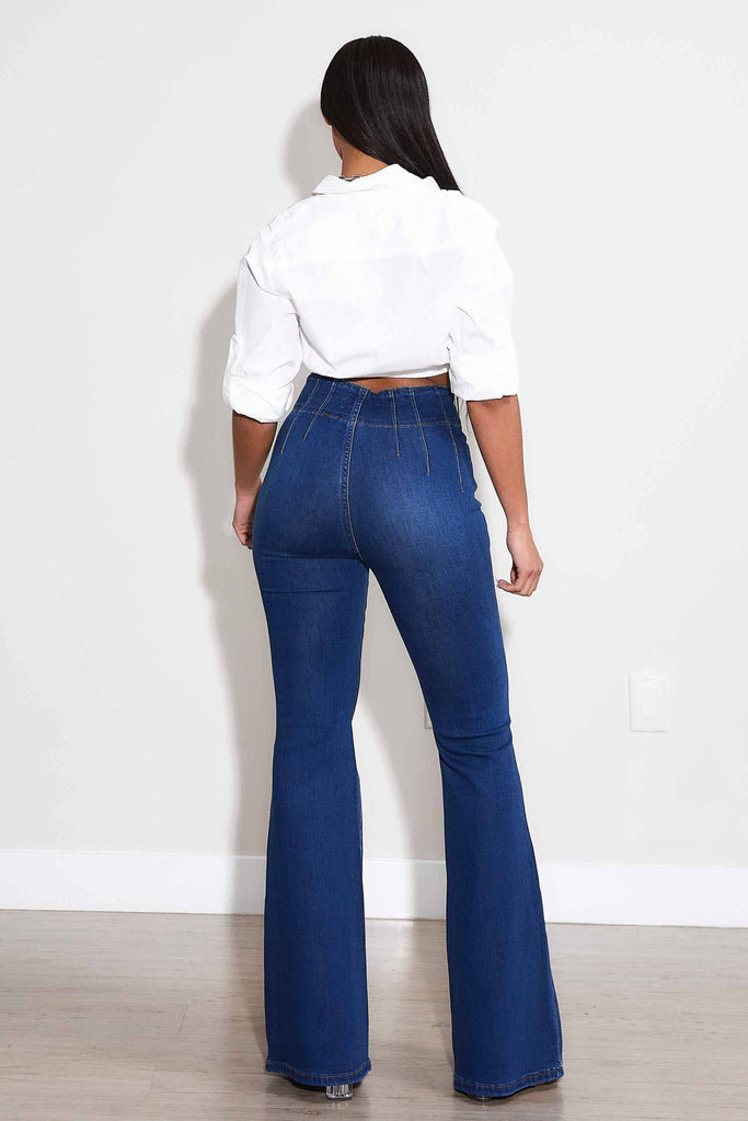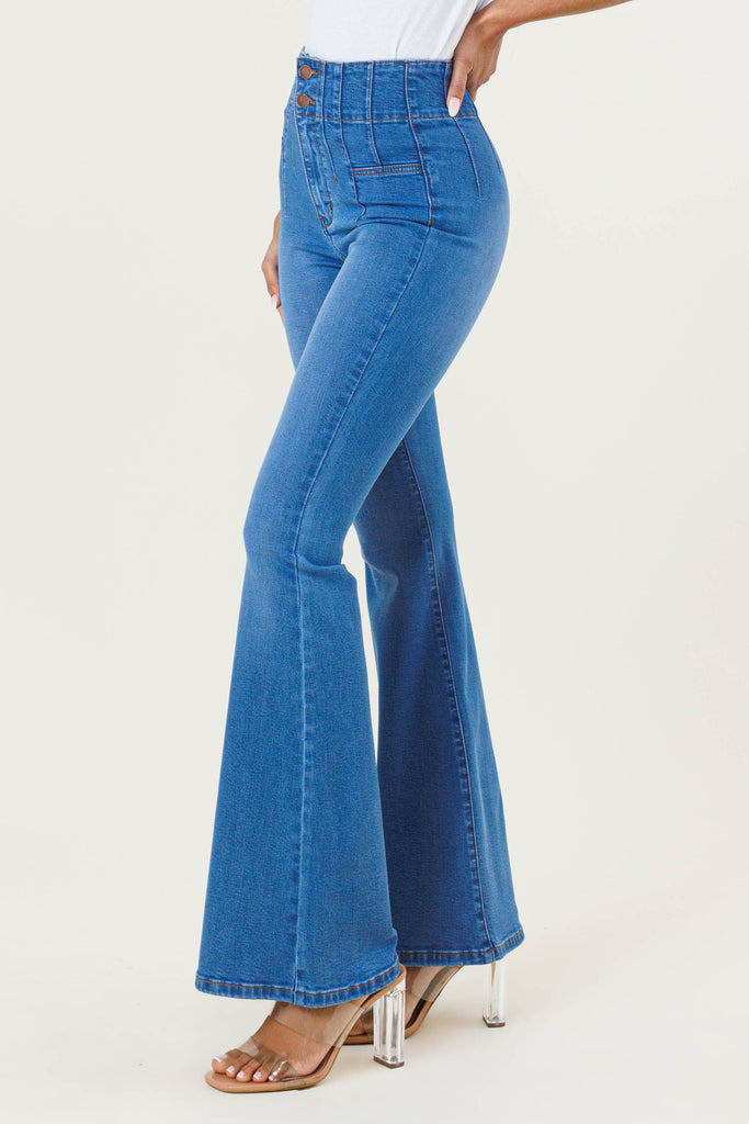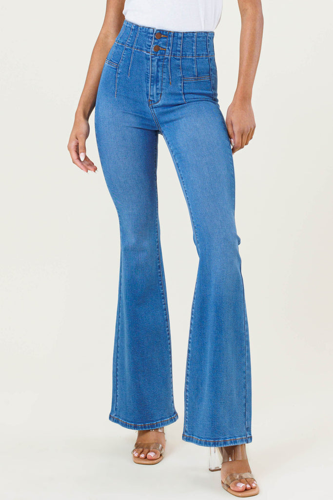 High-rise, flare jeans featuring multi-tacked waist design with two buttons, two back pockets, and a zip-fly closure.