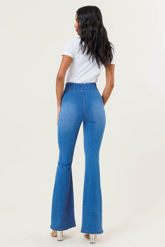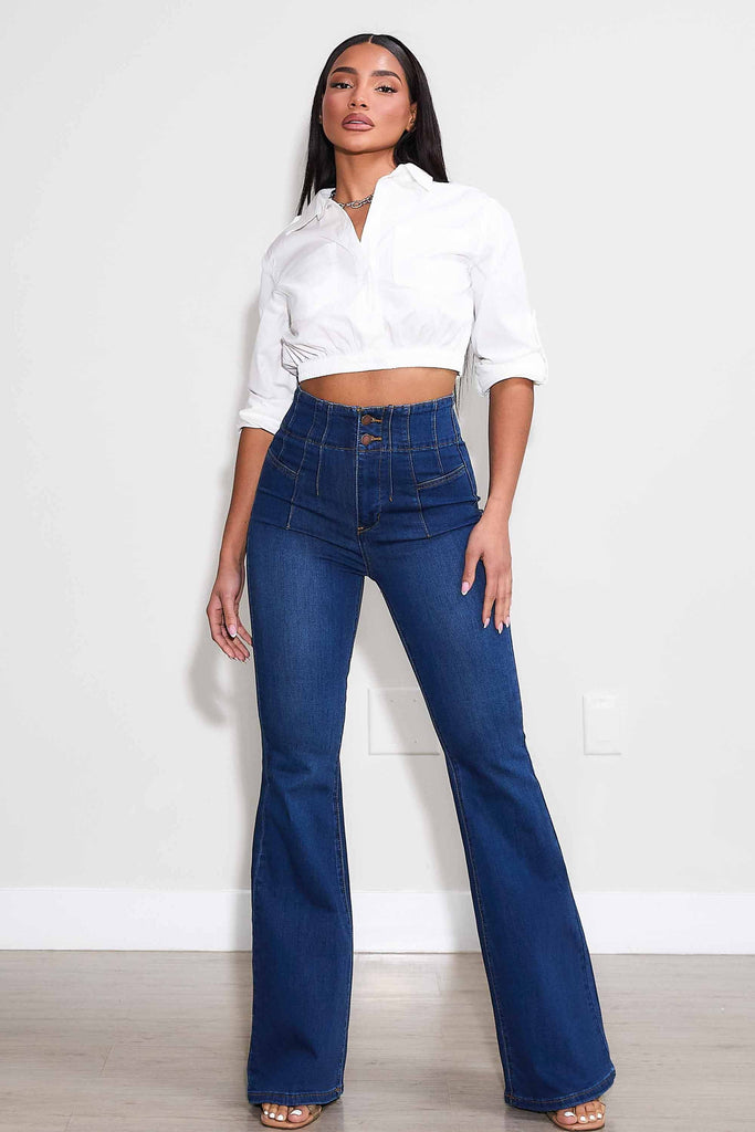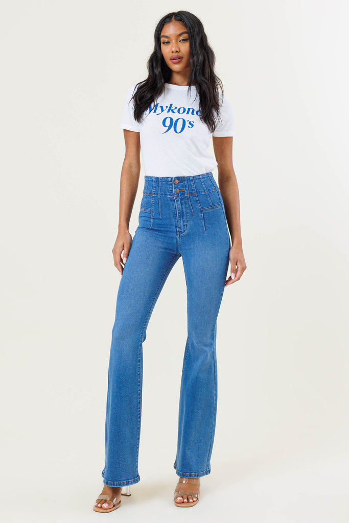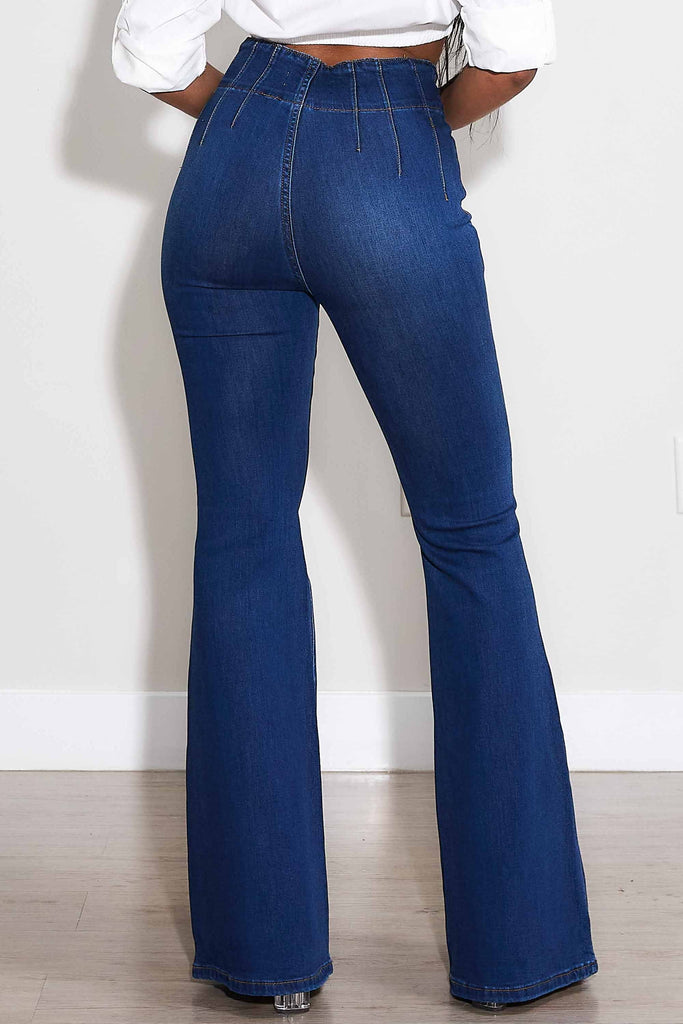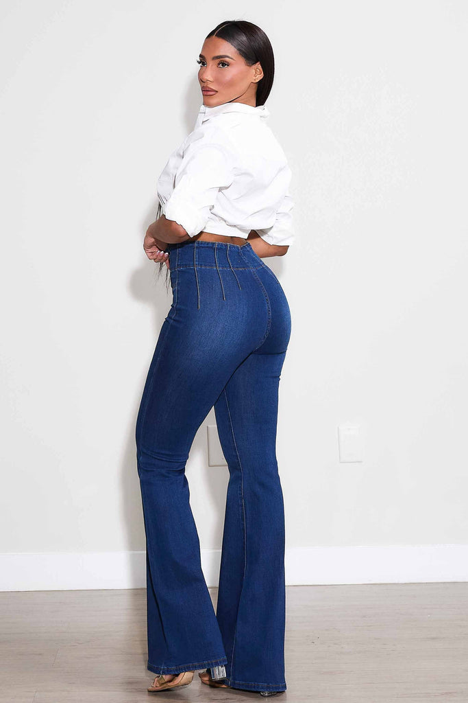 High-rise, flare jeans featuring multi-tacked waist design with two buttons, two back pockets, and a zip-fly closure.
