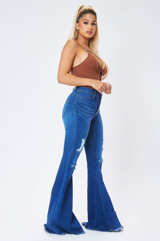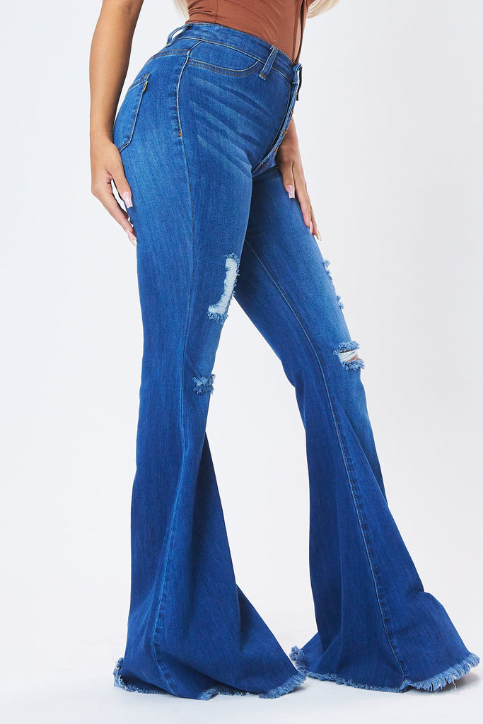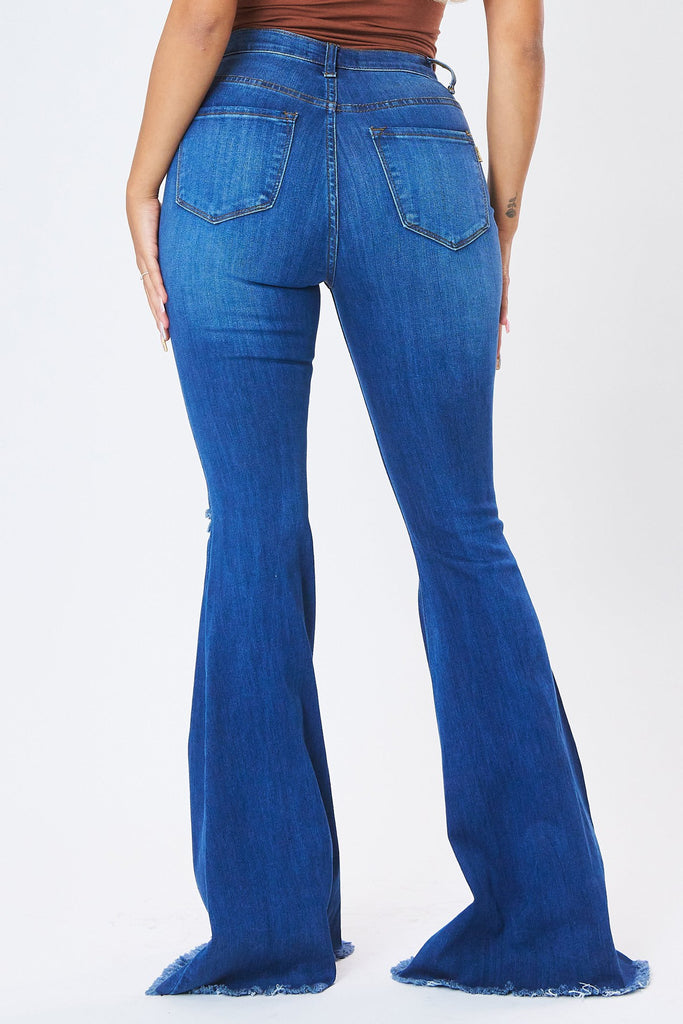 A pair of high-rise flare jeans featuring short fringed leg openings, subtle dirstressed front, faux front pockets, two back pockets, and 5-button up closure.