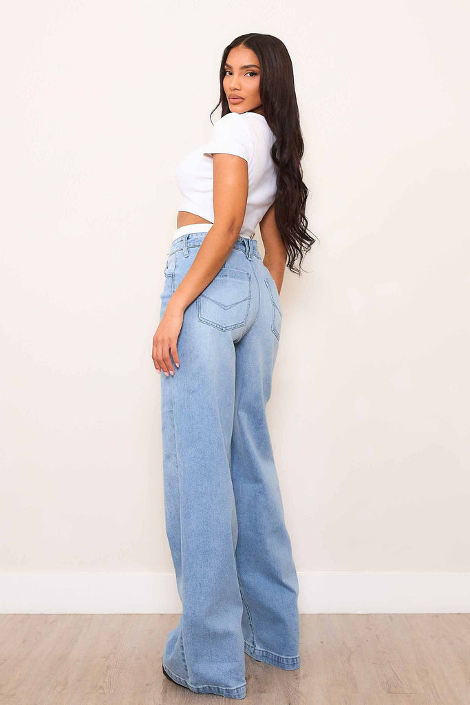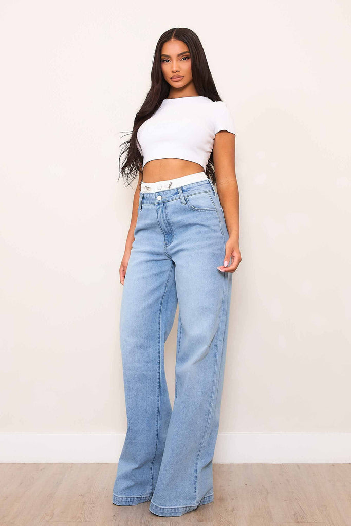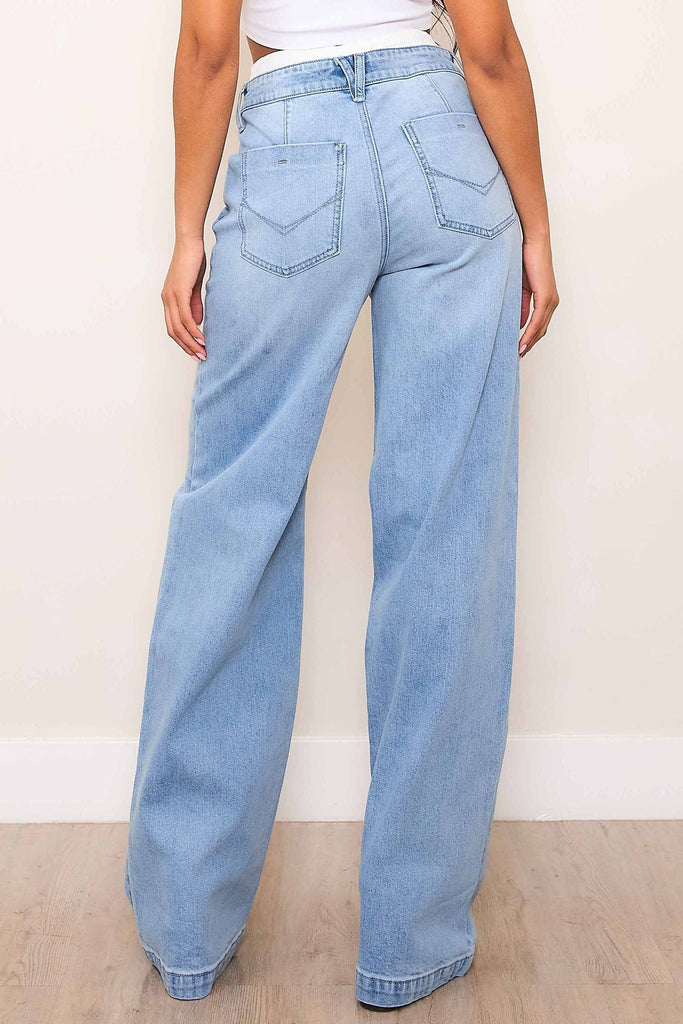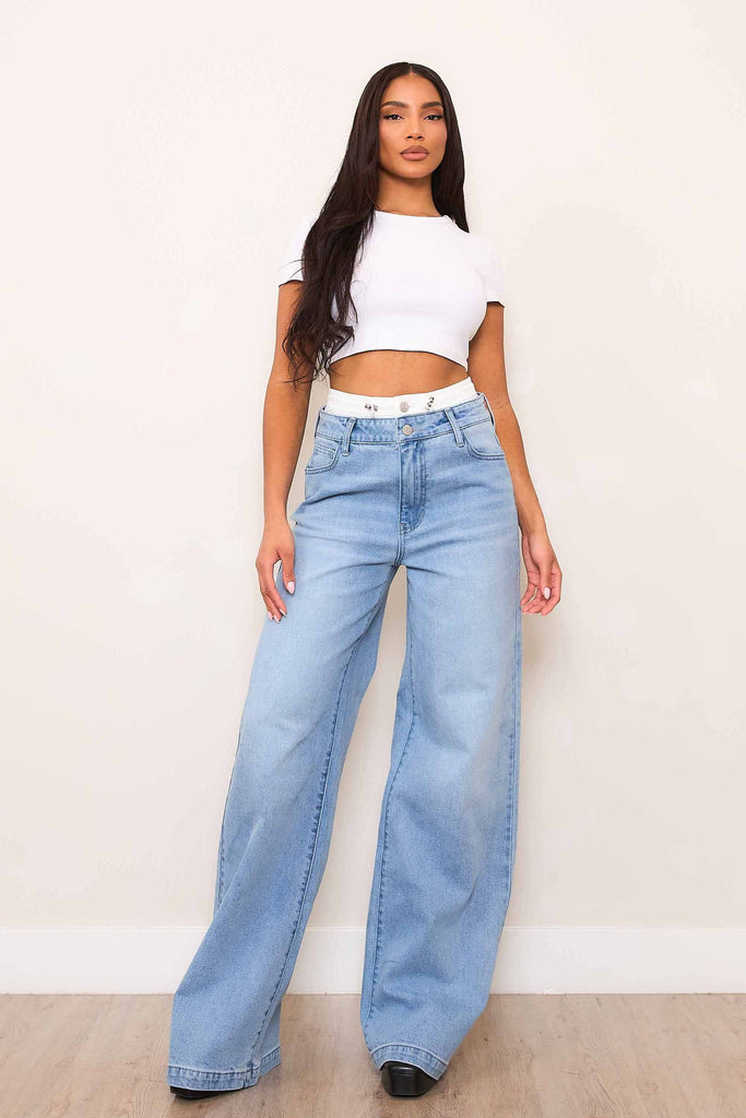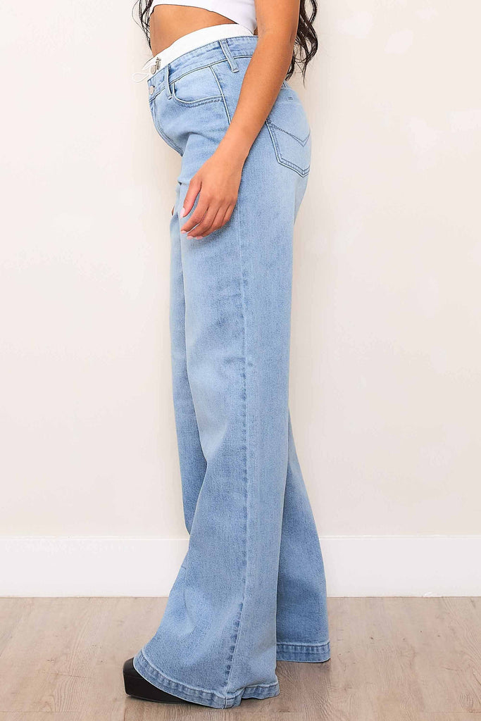 A pair of wide leg jeans featuring double waist band with draw cords, classic 5-pocket construction and a zip-fly closure.