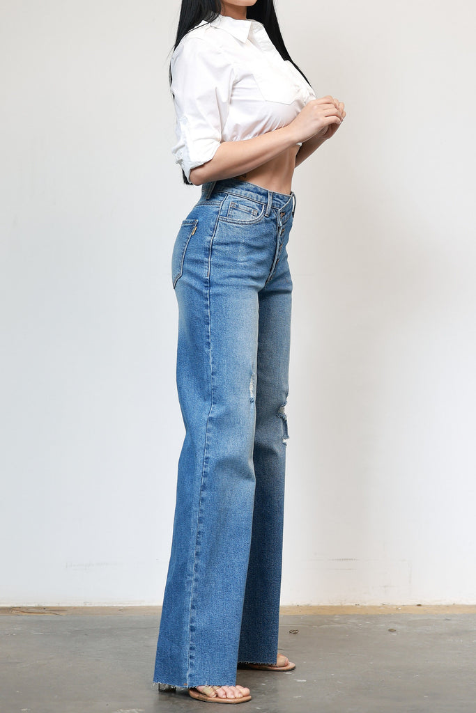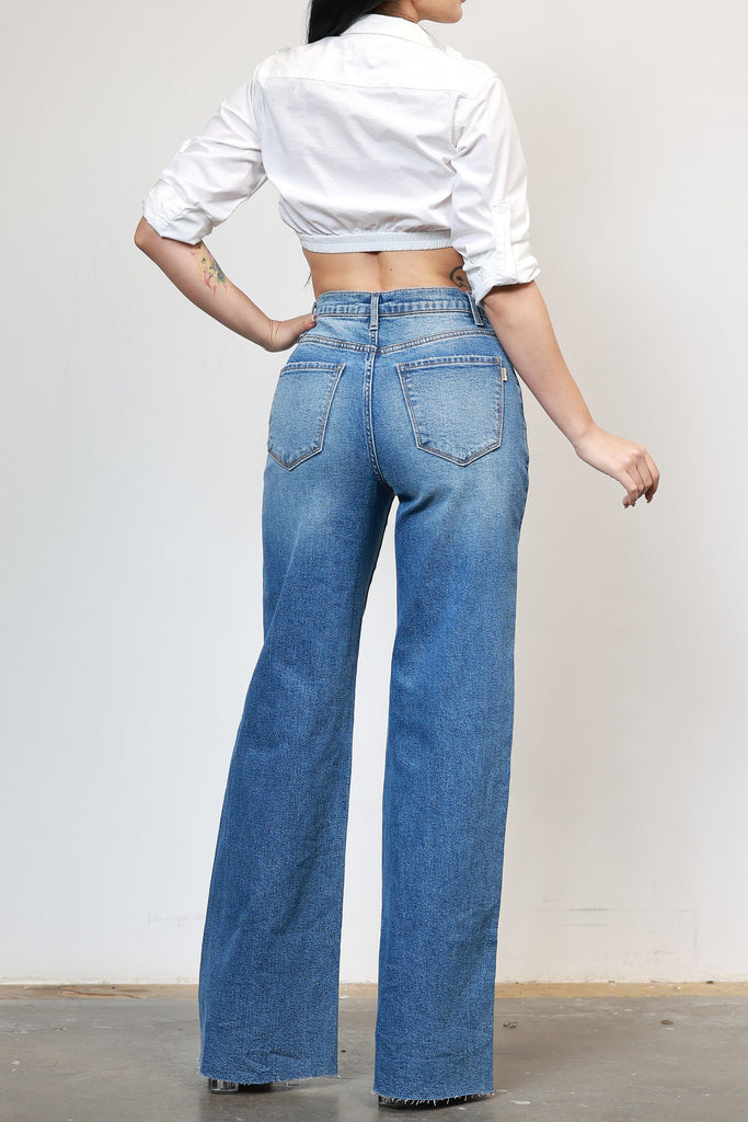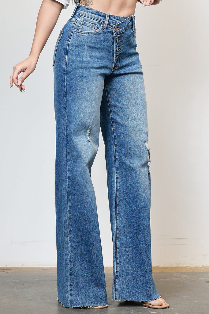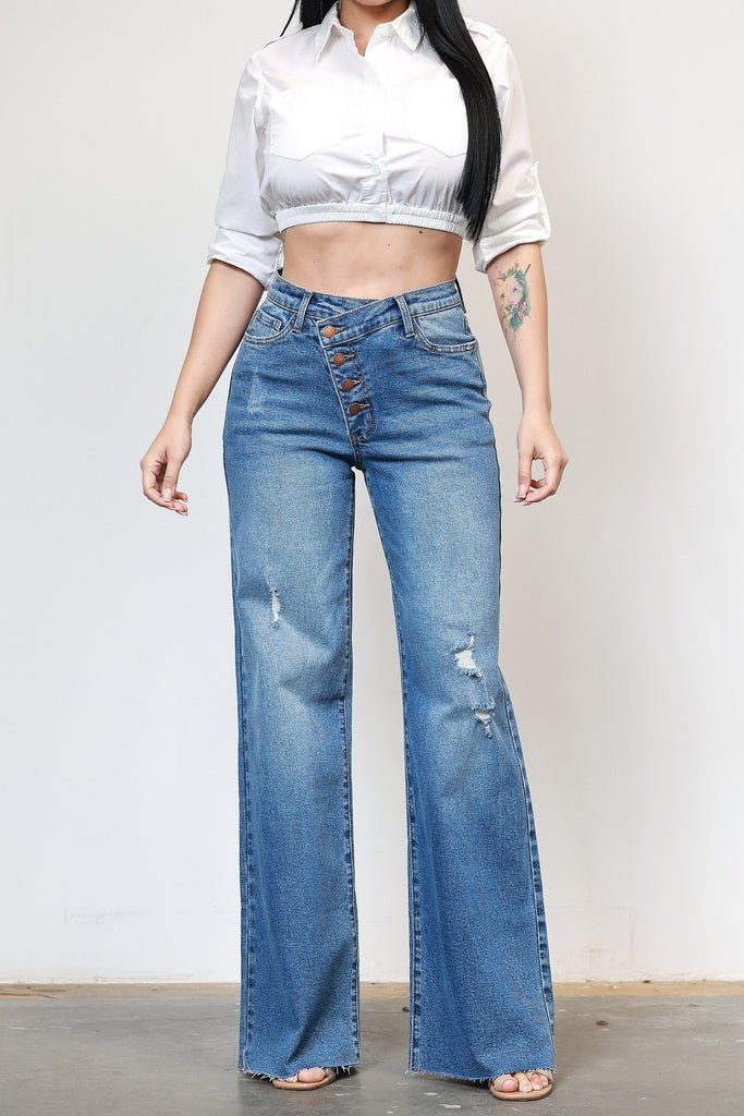A pair of high-rise wide leg jeans featuring a criss cross waist line, raw edge leg openings, classic 5-pocket construction, and 4 button up closure.