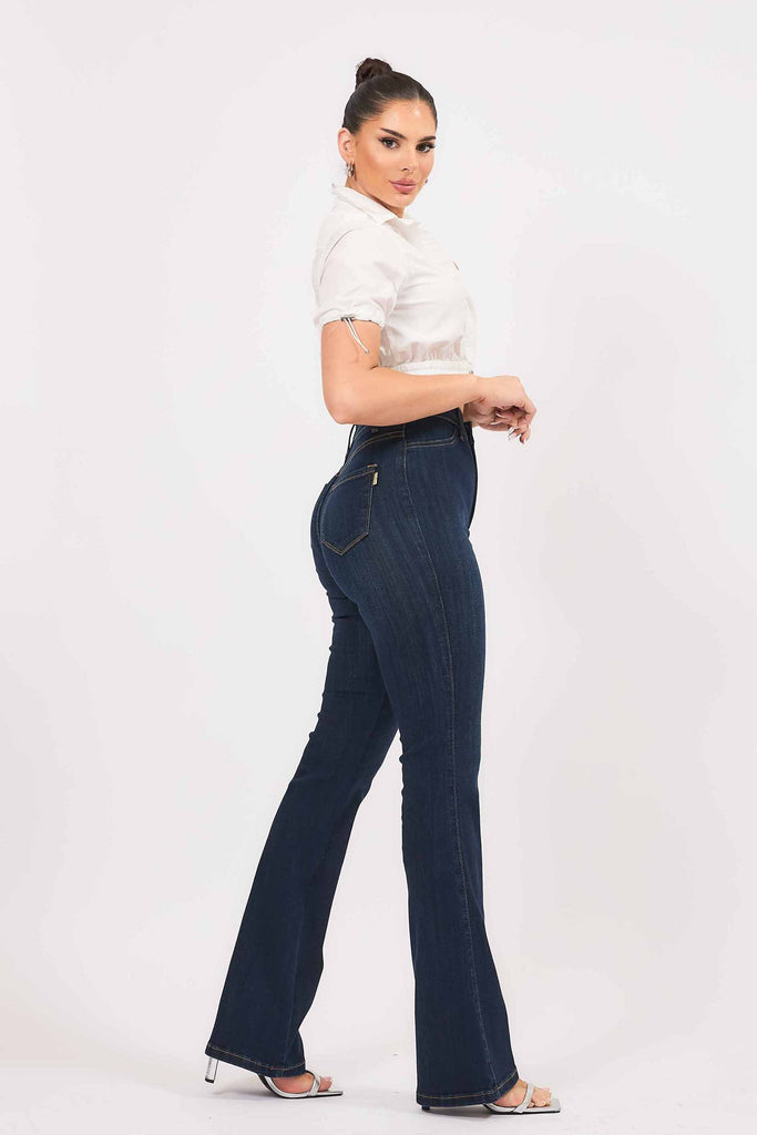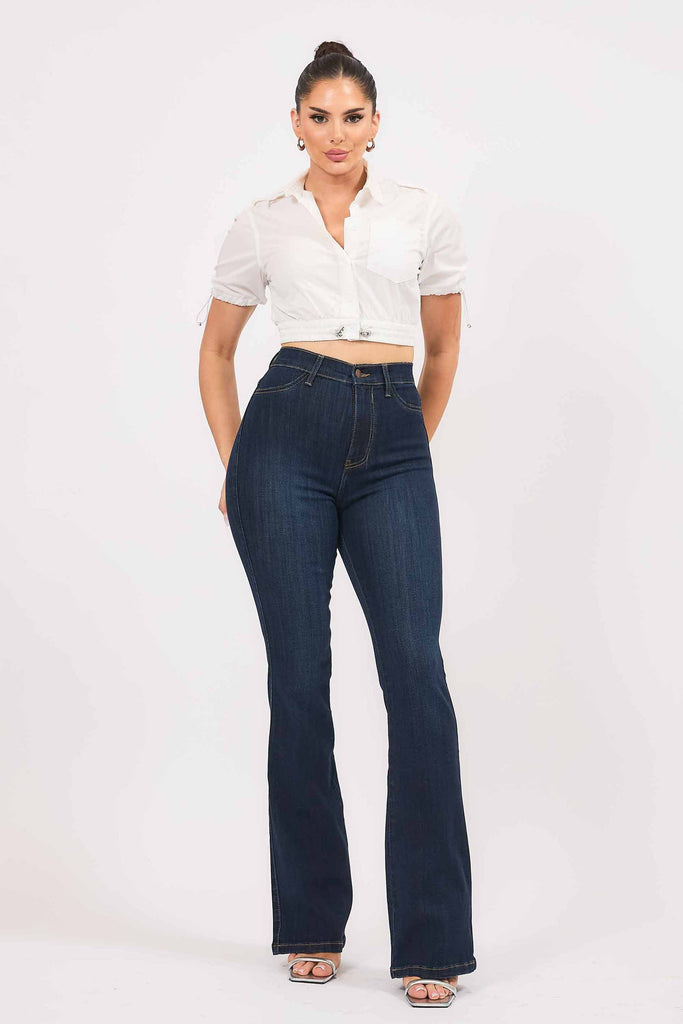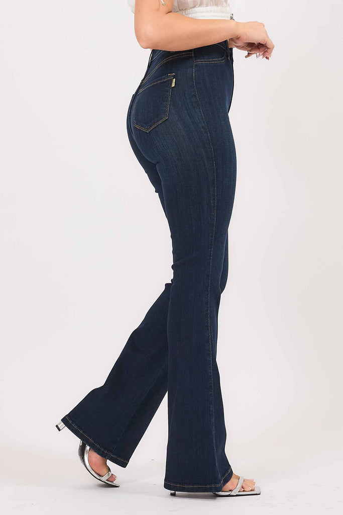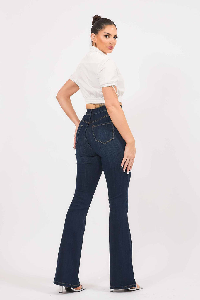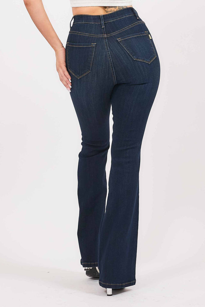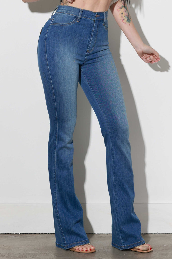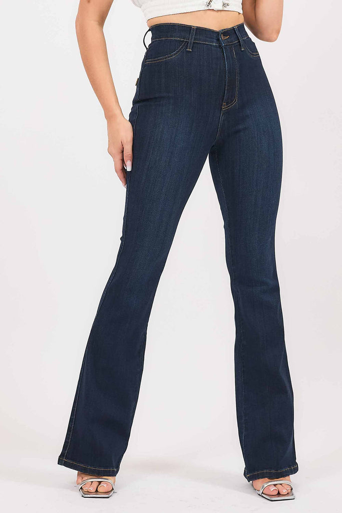 A pair of high-rise bootcut jeans featuring front & back pockets and a zip-fly closure.