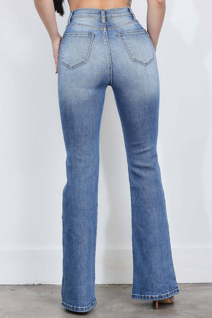 A pair of high-rise bootcut jeans featuring classic 5-pocket construction and zip-fly closure.