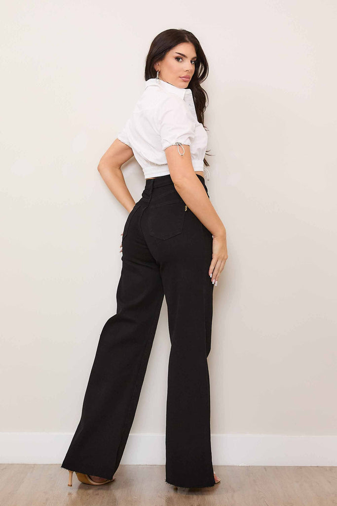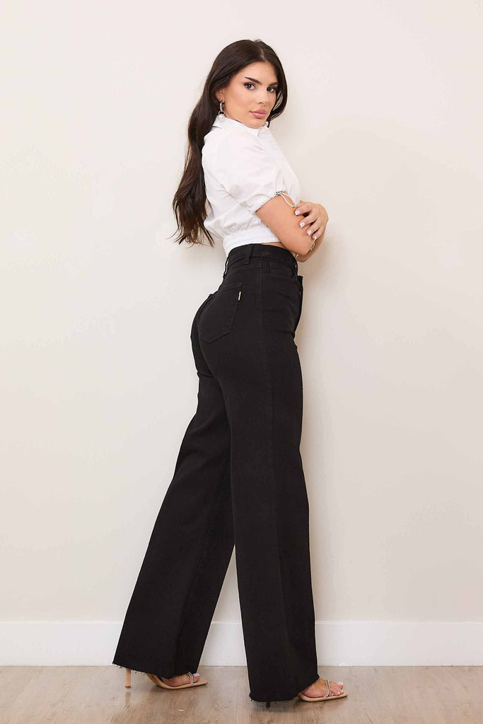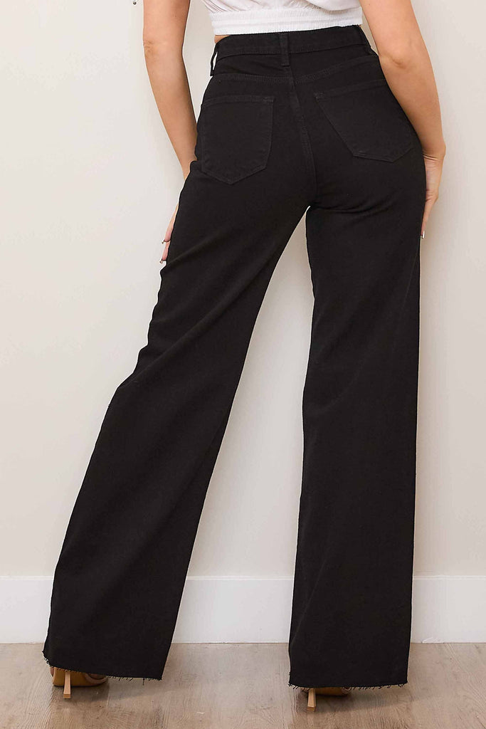 A pair of high-rise wide leg jeans featuring crossed waist line, raw cut hem, classic 5-pocket construction and a zip-fly closure.