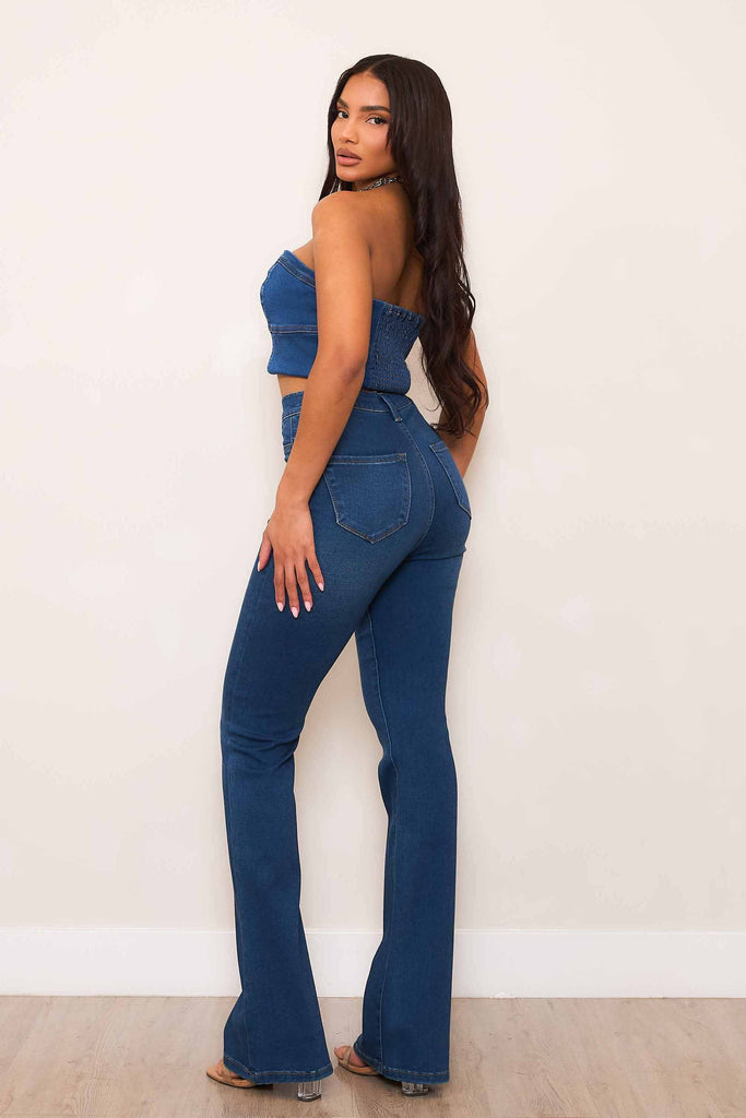 A pair of high-rise bootcut jeans featuring faux front pockets, back pockets and a zip-fly closure.