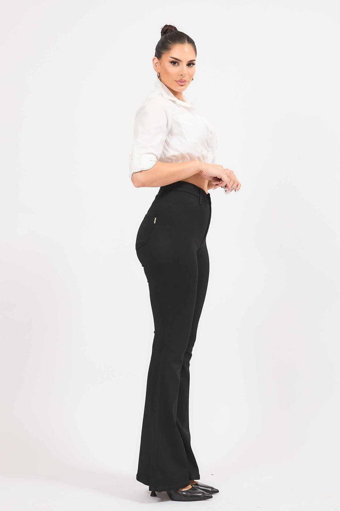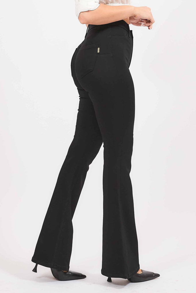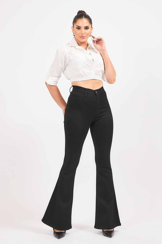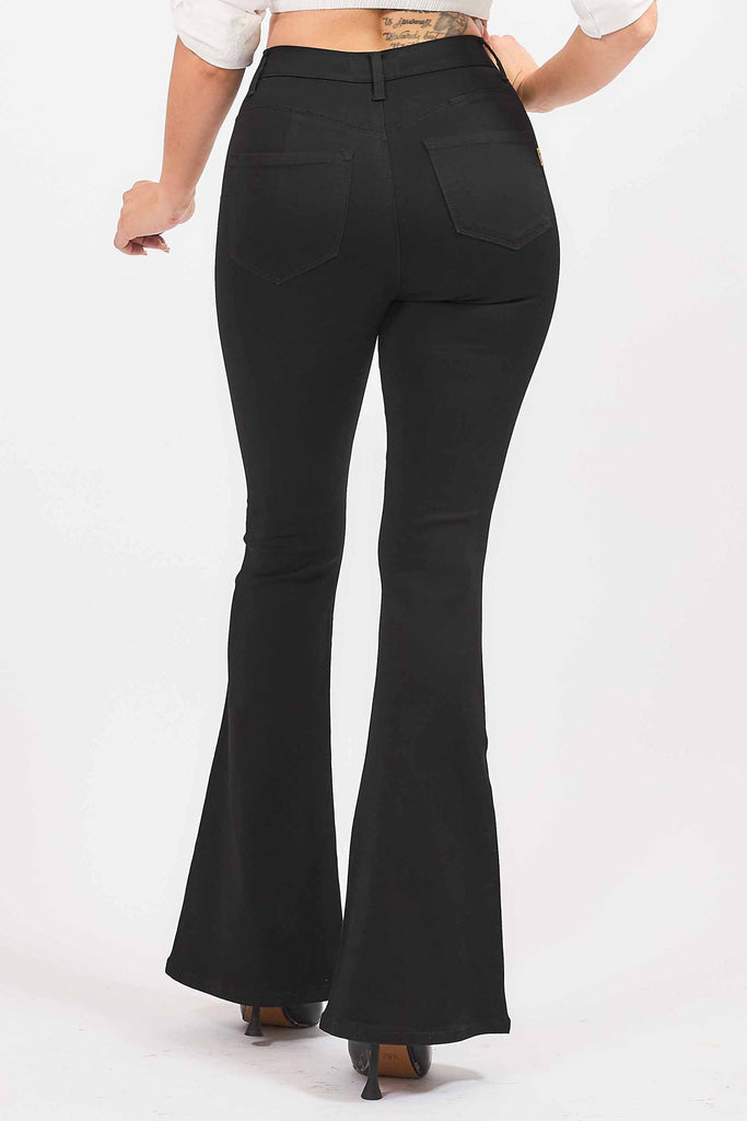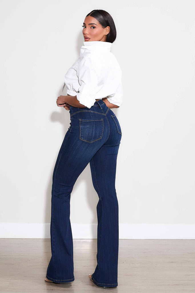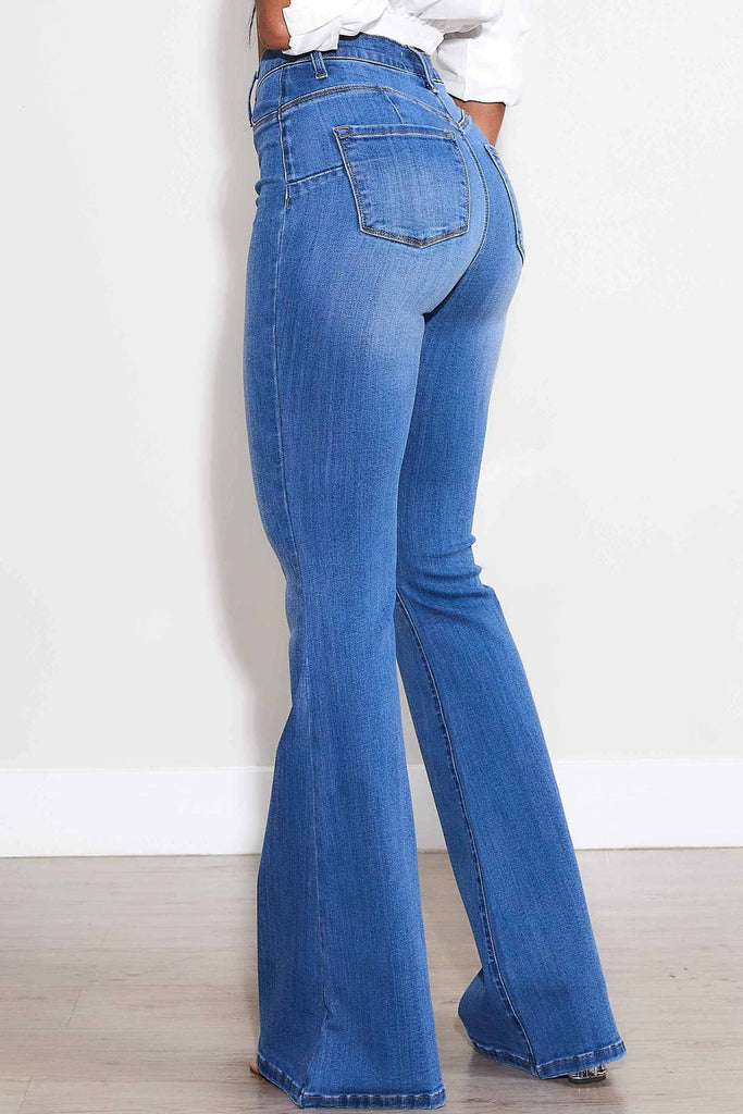 A pair of flare jeans featuring faux front pockets, back pockets and a zip-fly closure.